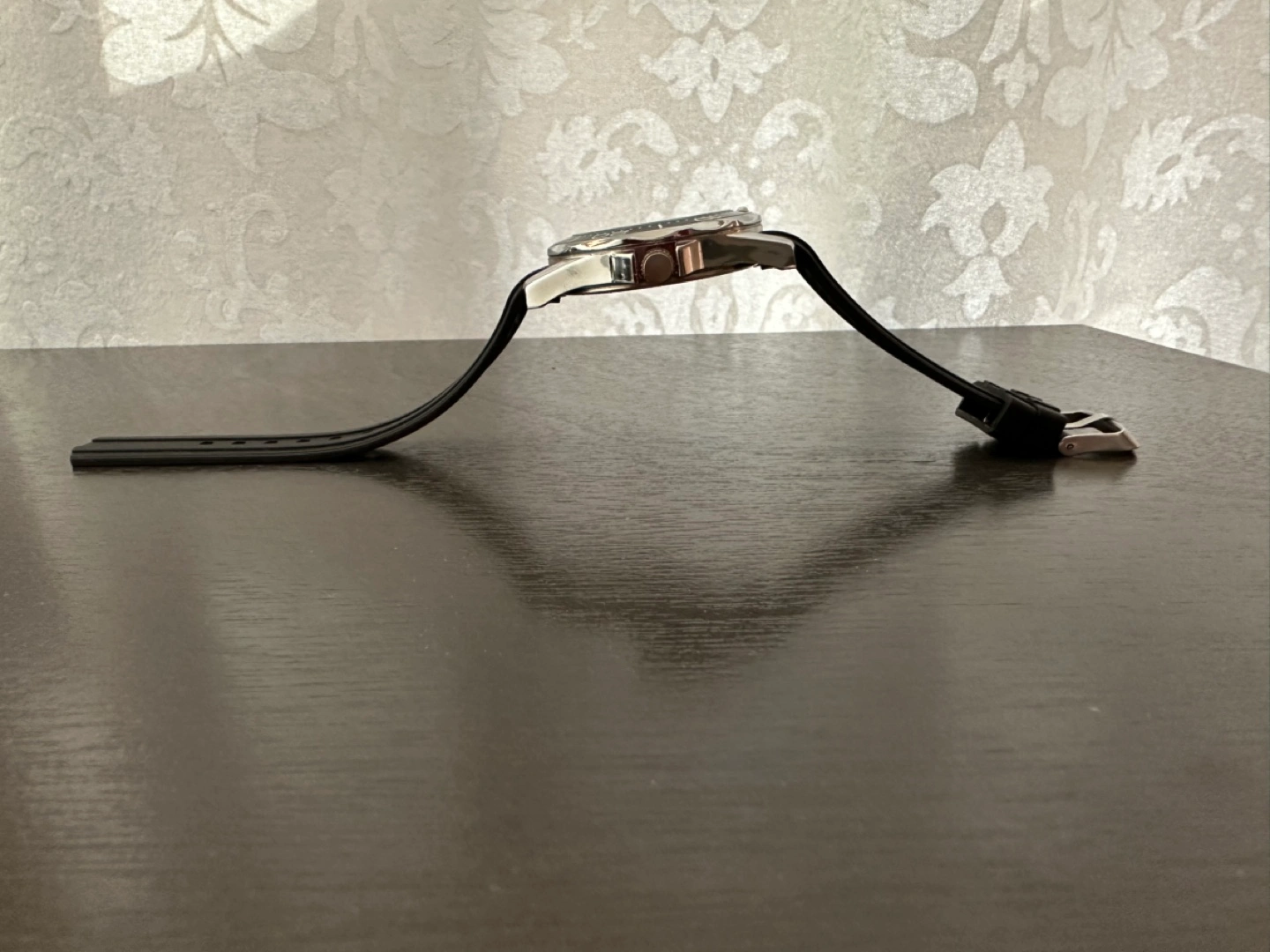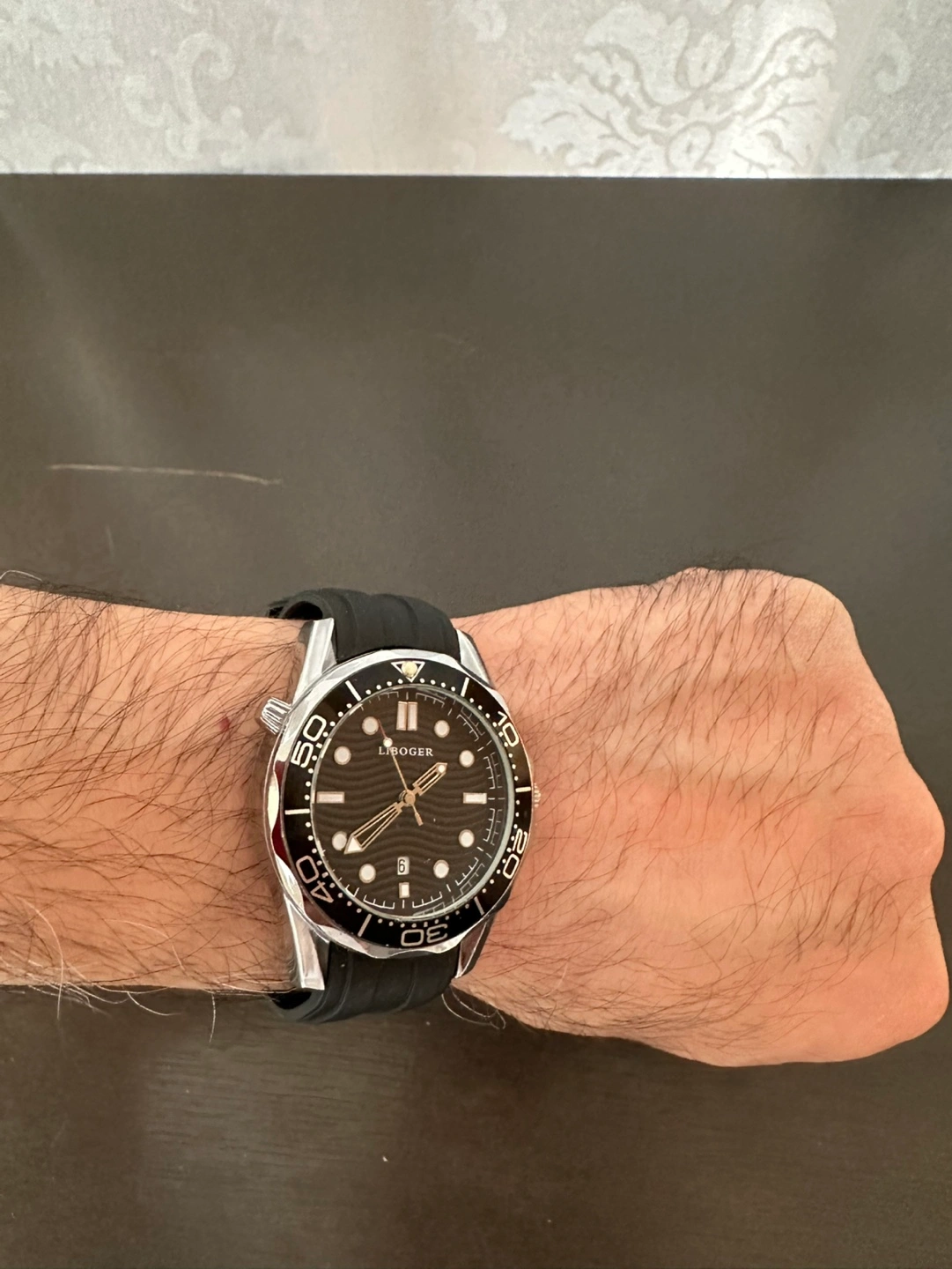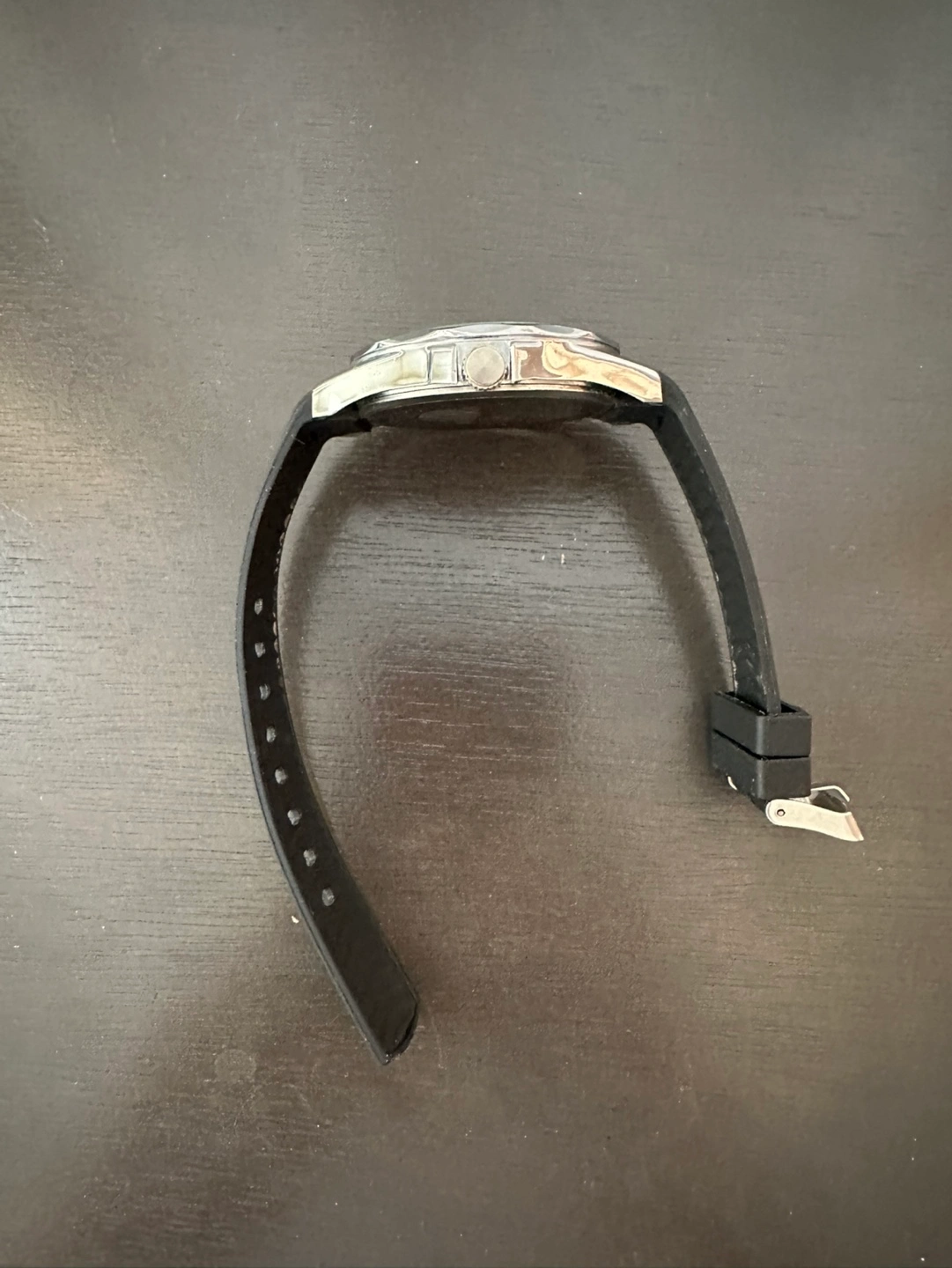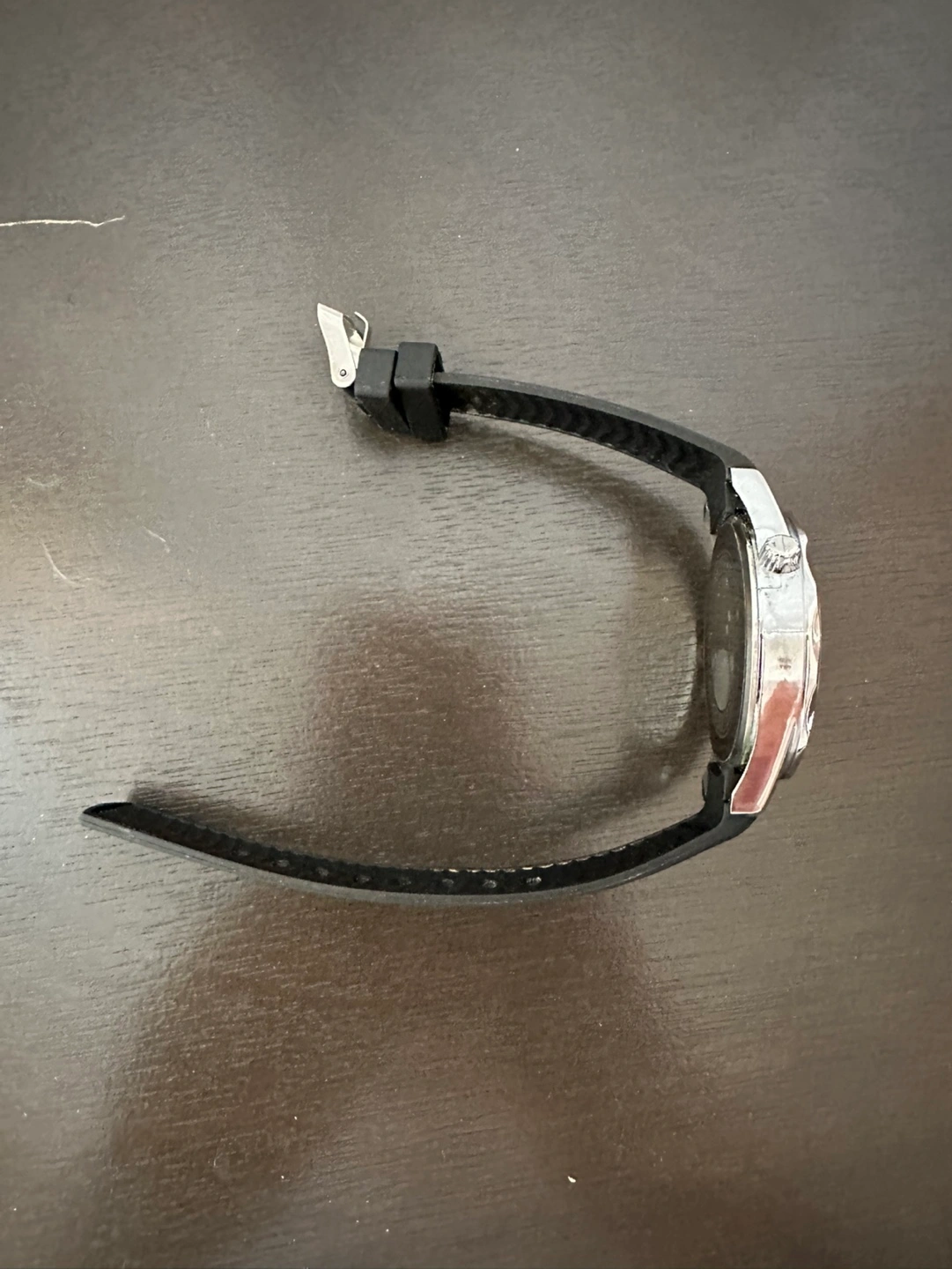 Men's Liboger wristwatch. Black dial. Date, silver casing. Rubber band. Looks sporty and keeps good time. Clean and no issues. Pick up near Scarborough Town Centre. The knob at the top left is cosmetic and has no function.