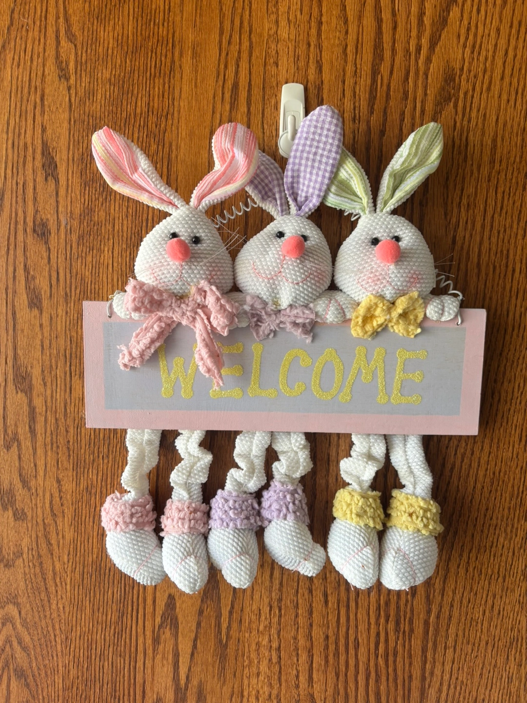 Cute Easter bunny welcome hanging sign. Excellent condition . Wooden background with three stuffed cloth bunnies . 12 1/4 W x 14” H