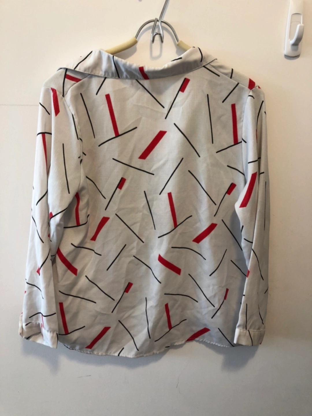 Long-sleeved button-up blouse. Off-white base with red and black abstract print. Relaxed fit. Lightweight material.