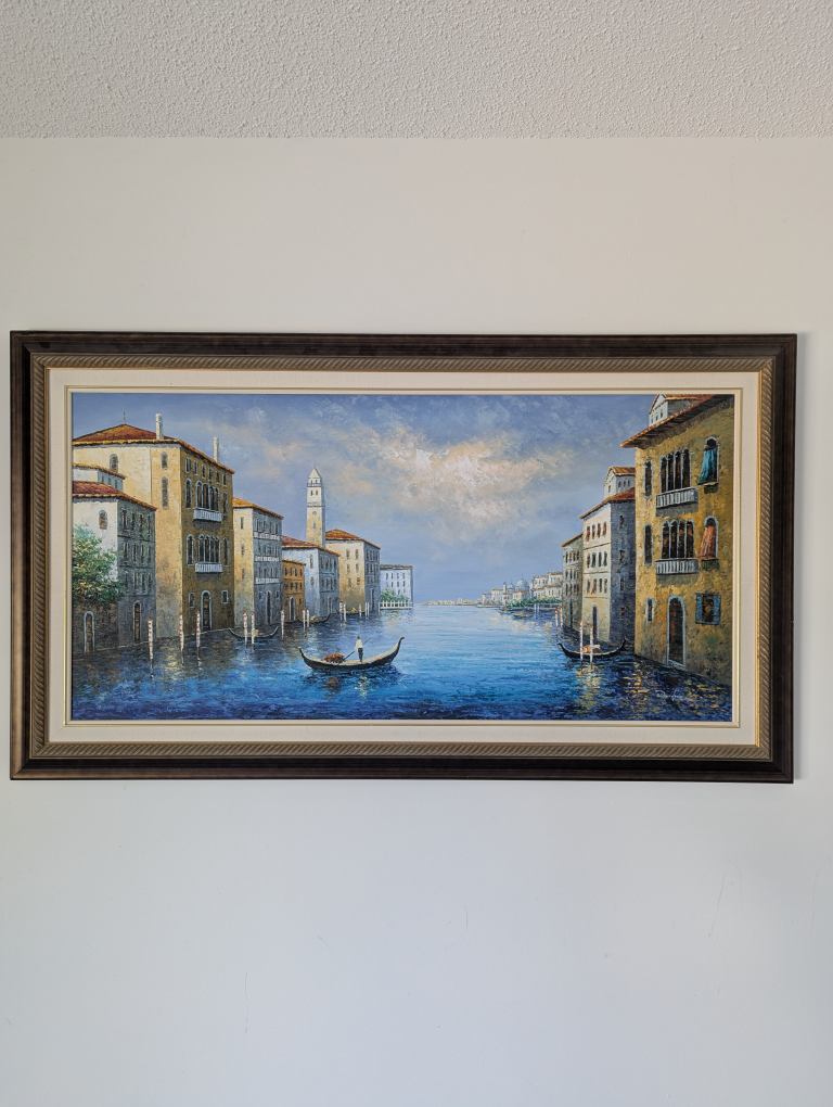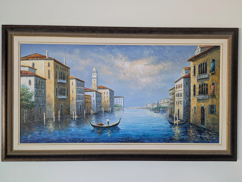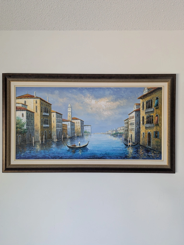 Spruce up your living space with this captivating framed painting, showcasing a serene Venetian canal scene. The artwork features intricate details and rich colors, bringing a touch of European elegance to any room. This piece is previously owned and while in good condition, may have minor signs of wear that add to its character.