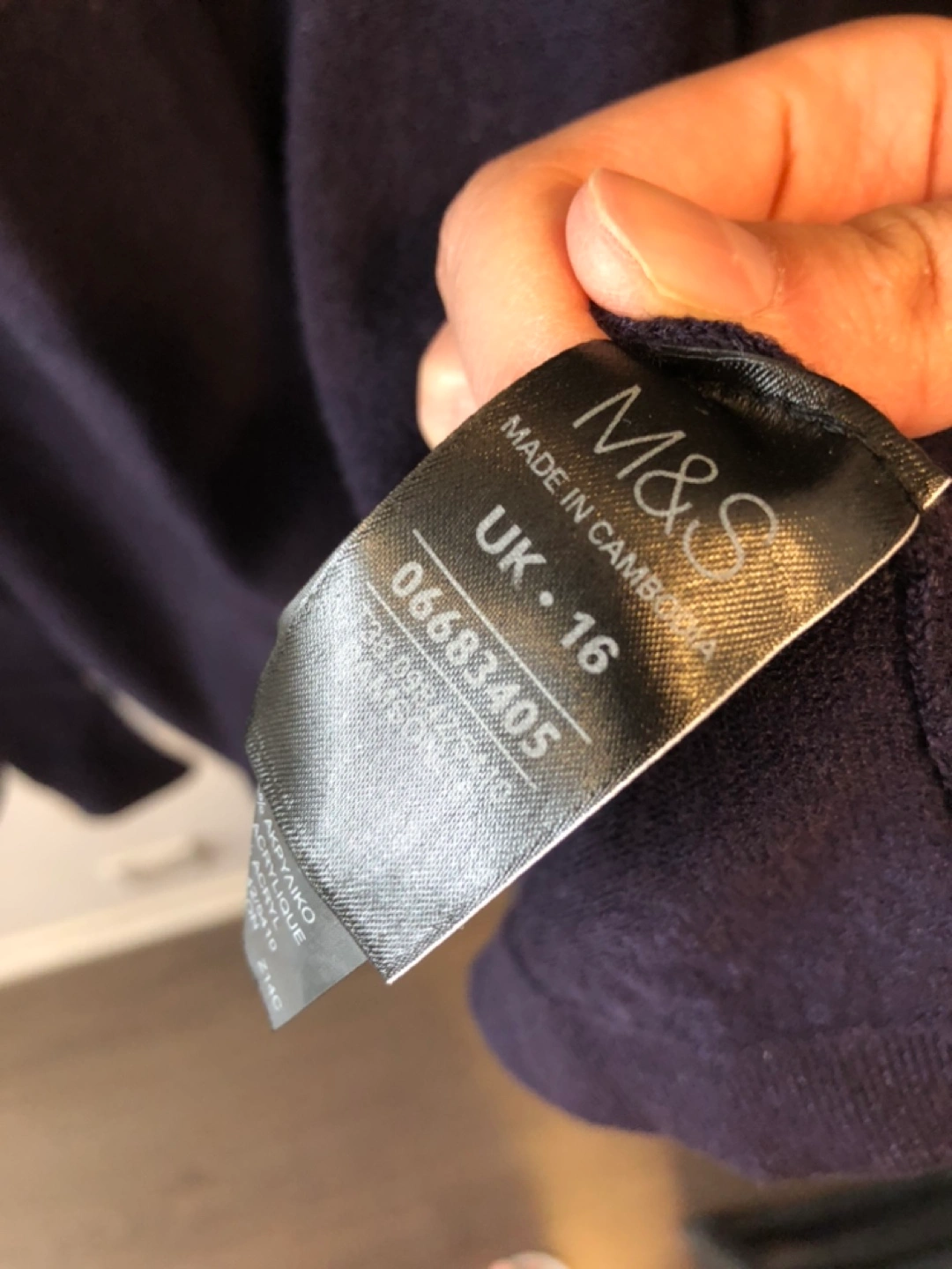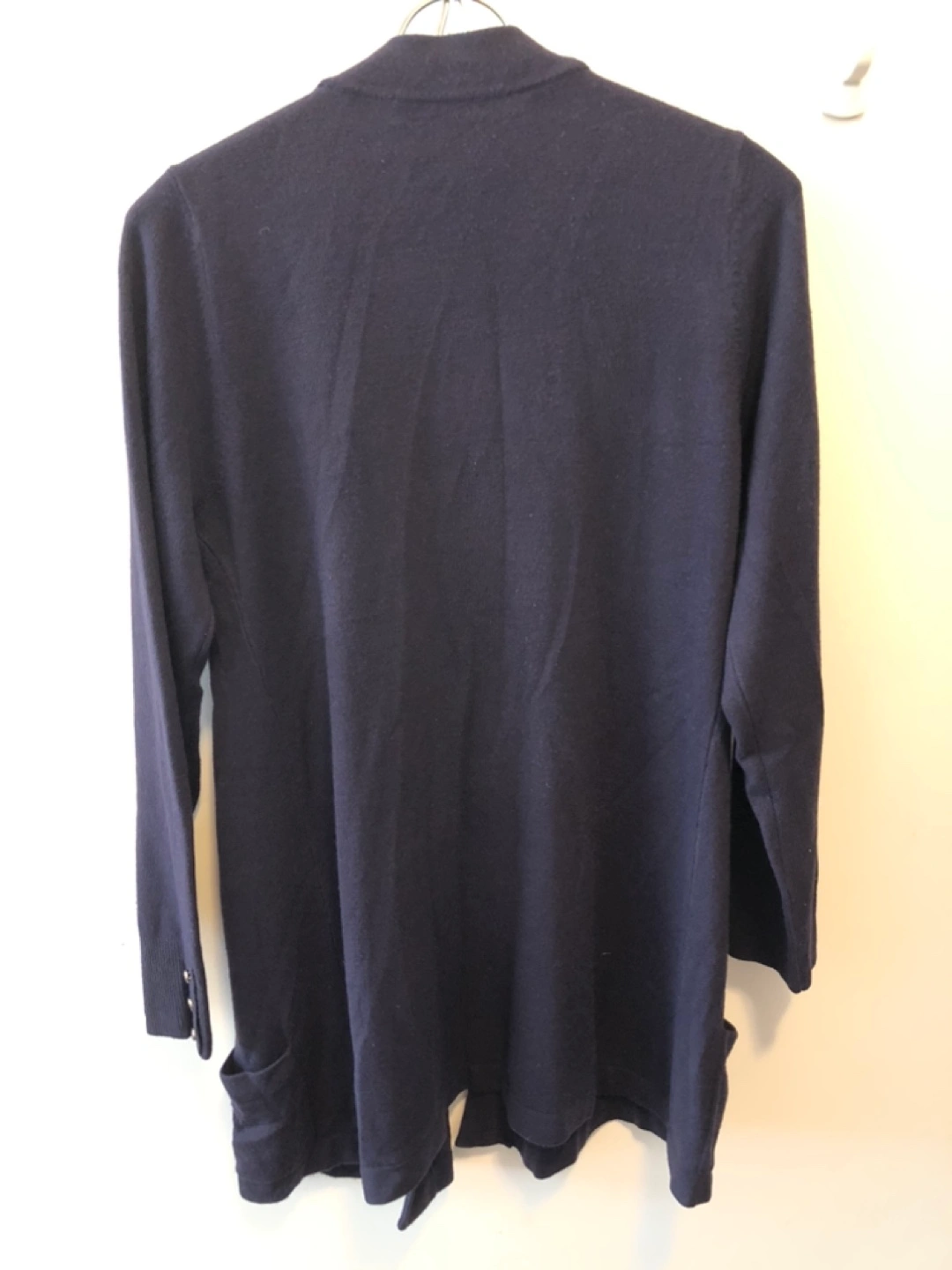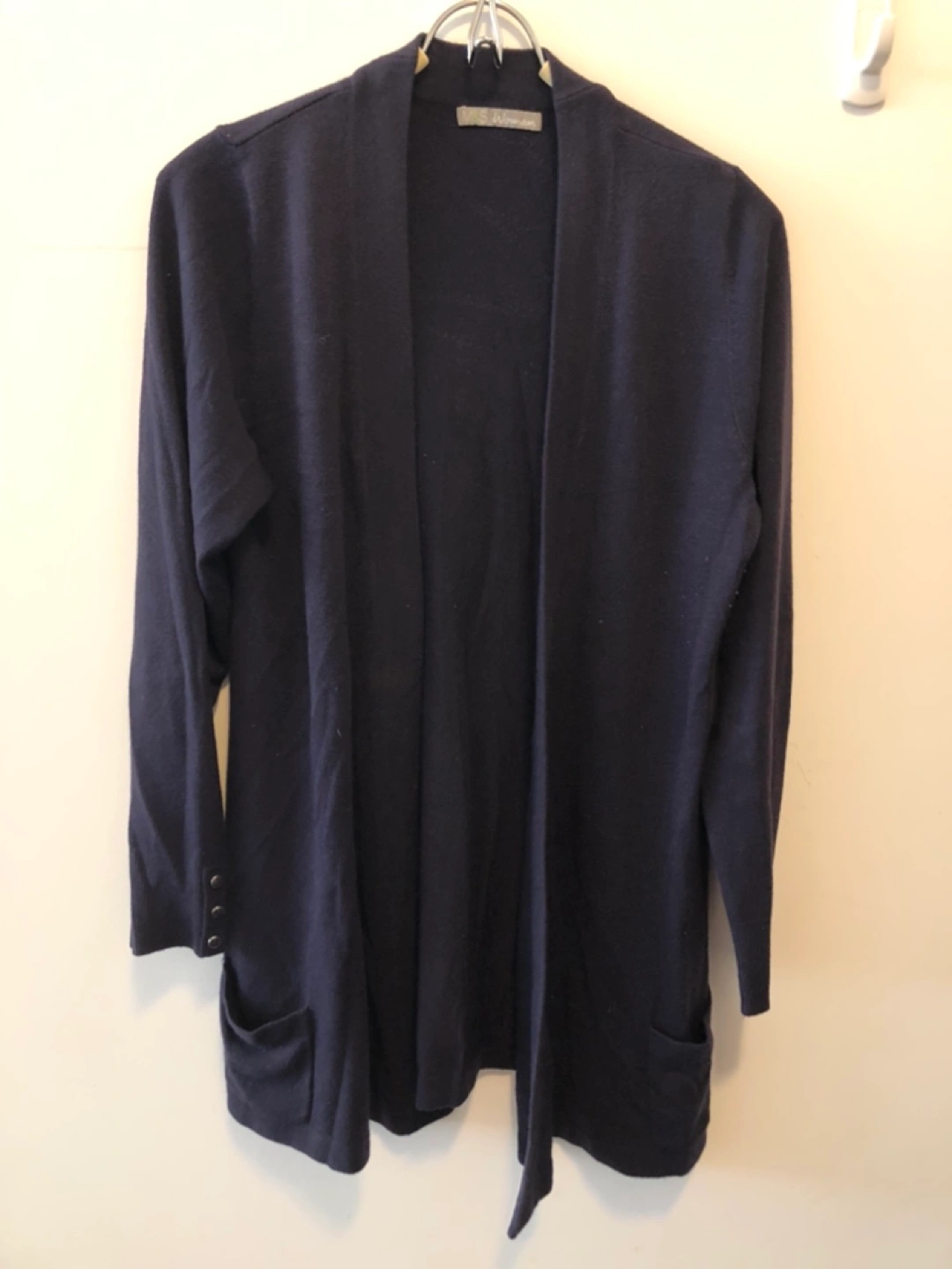 Long-sleeved navy blue cardigan. Open front. Features pockets. Size UK 16. Made in Cambodia. Cash/E-transfer only First come first serve Deals if combined with my other listings