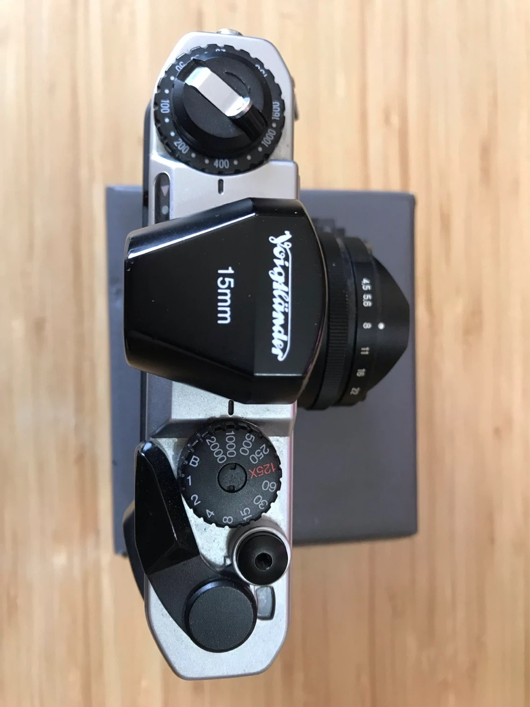 This is a Voigtländer Bessa-L 35mm film camera. It's paired with a Voigtländer 15mm f/4.5 Super Wide-Heliar Aspherical lens. This camera is known for its compact design and manual controls.