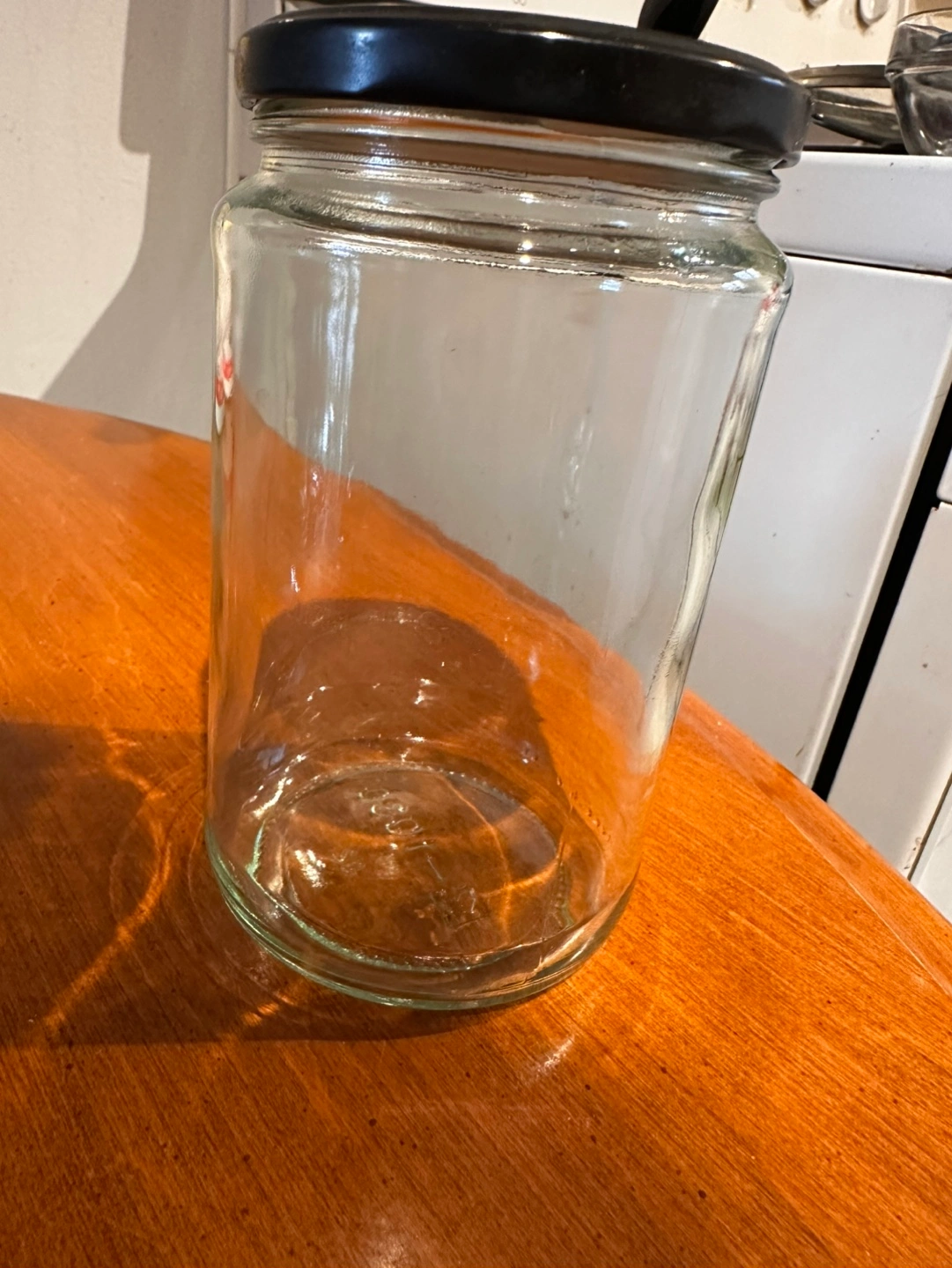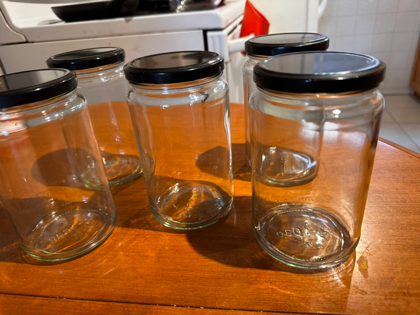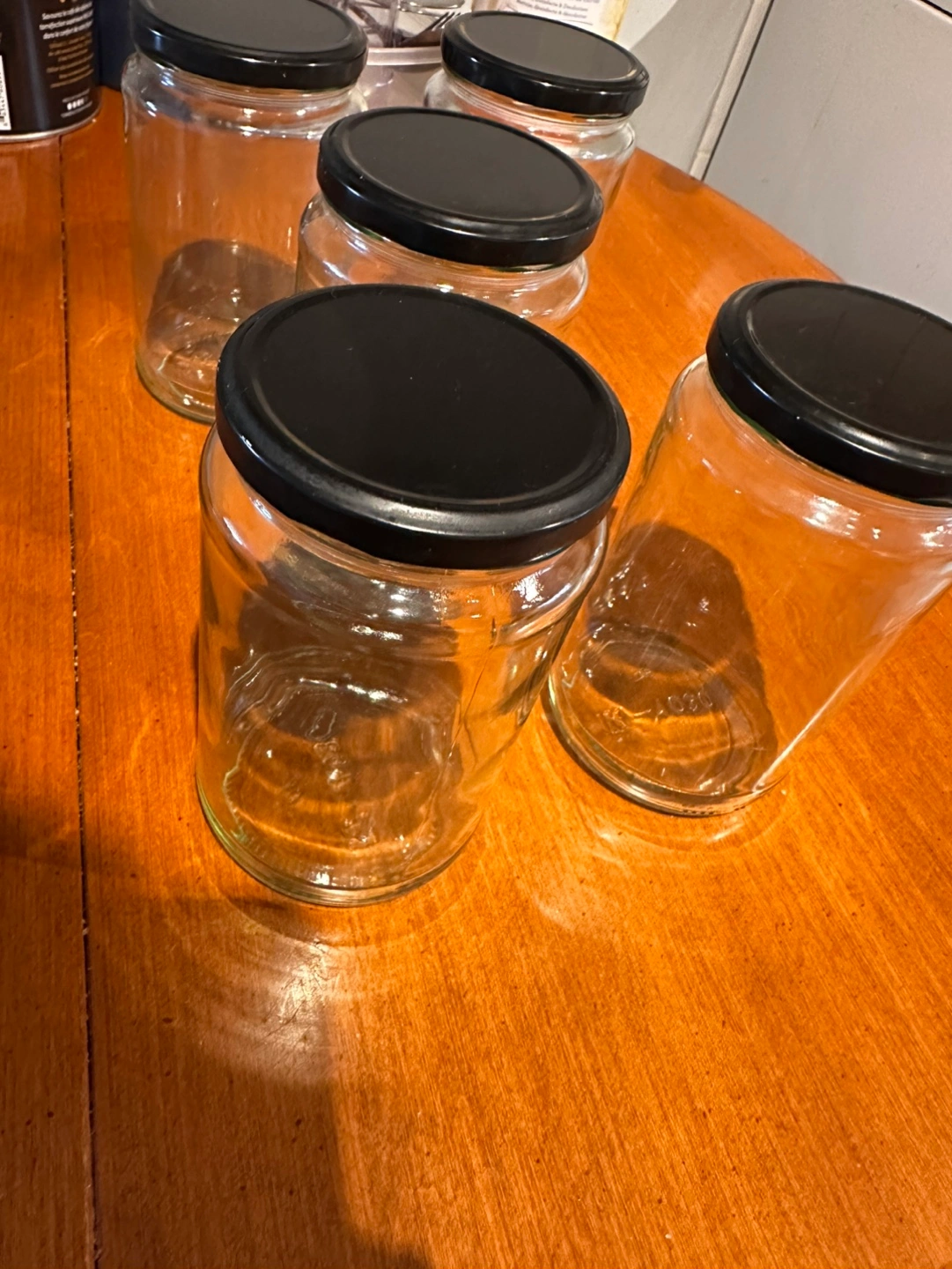 Set of 5 empty glass jars. Clear glass, black lids. Perfect for storing food, crafts, or organizing. 750ML each