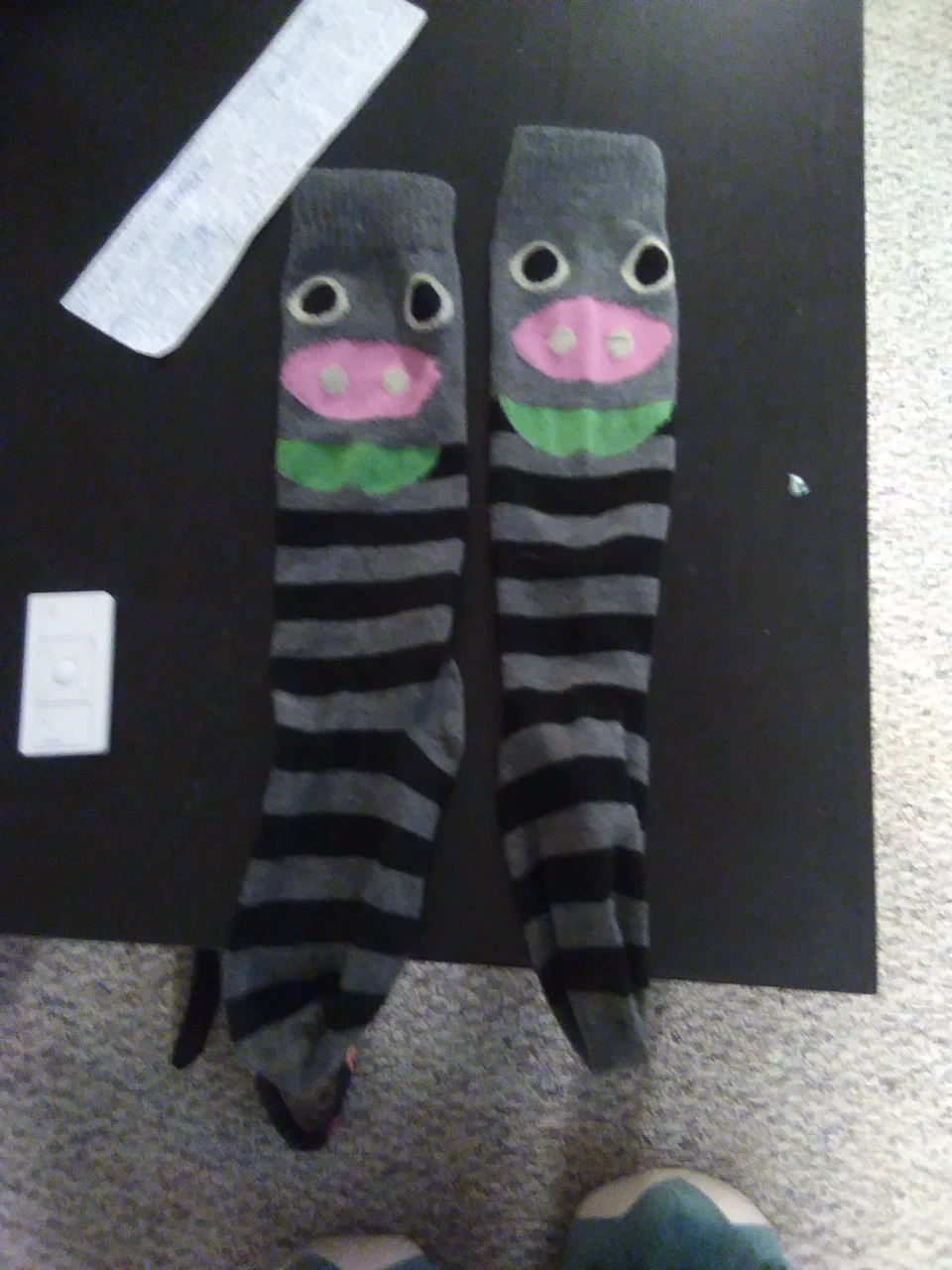 gray pig striped socks. quite old but still in good condition no holes or anything.fit size 7 feet or smaller maybe bigger. 2$ or will accept 1$. cash only