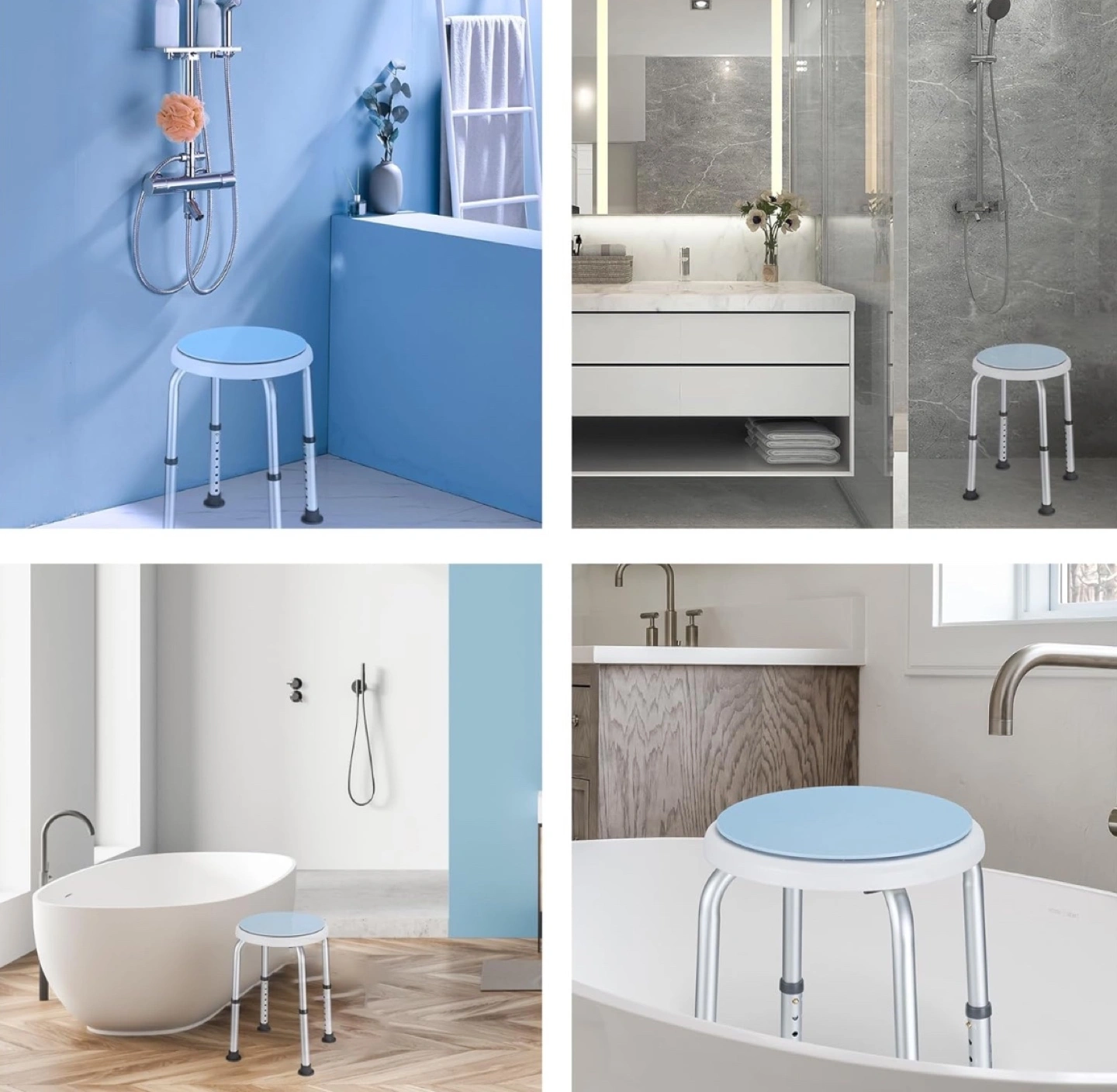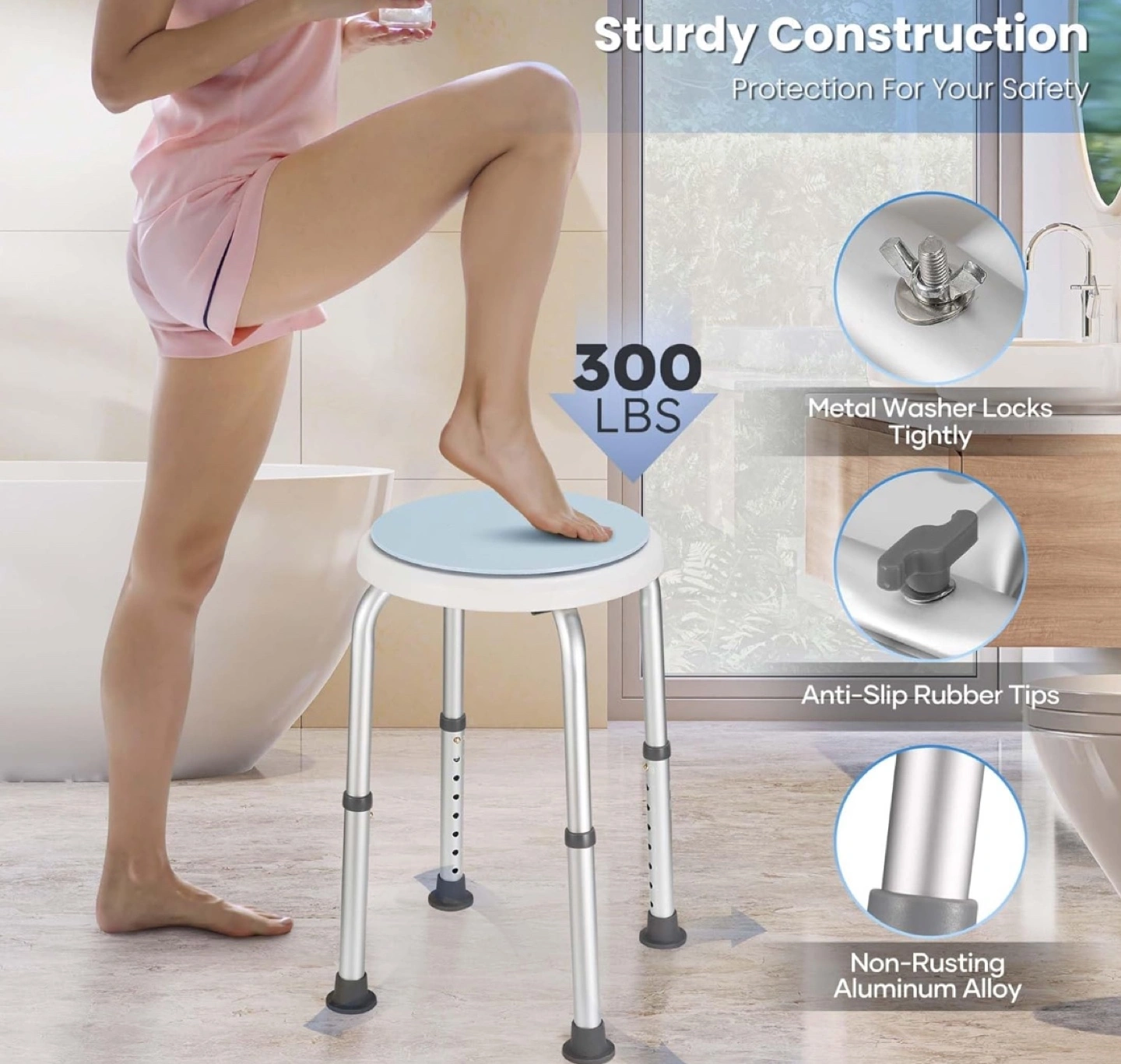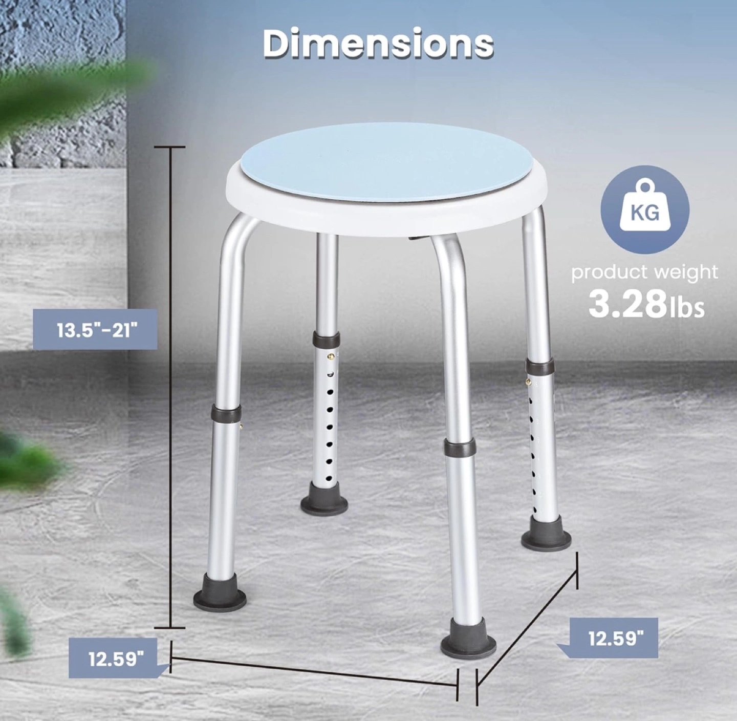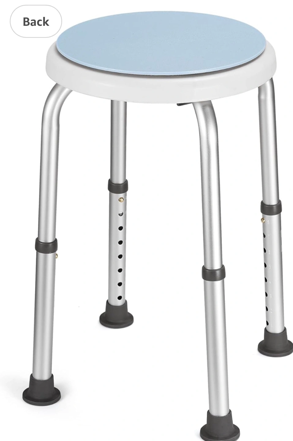 Only 1 week old, brand new. Lightweight, adjustable aluminum shower stool. Features a comfortable, non-slip seat and rubber tips for safety. Ideal for bathrooms and showers. Easy height adjustment.