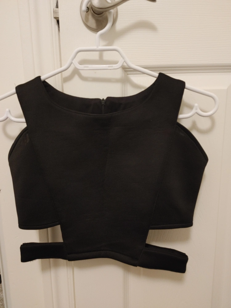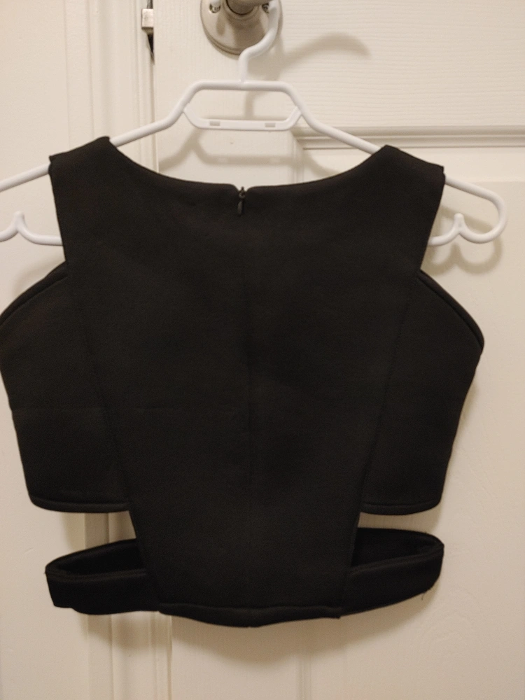 Two tops for sale(washed). One black crop top with cut-outs. One striped sleeveless top with a zipper. Size 8.