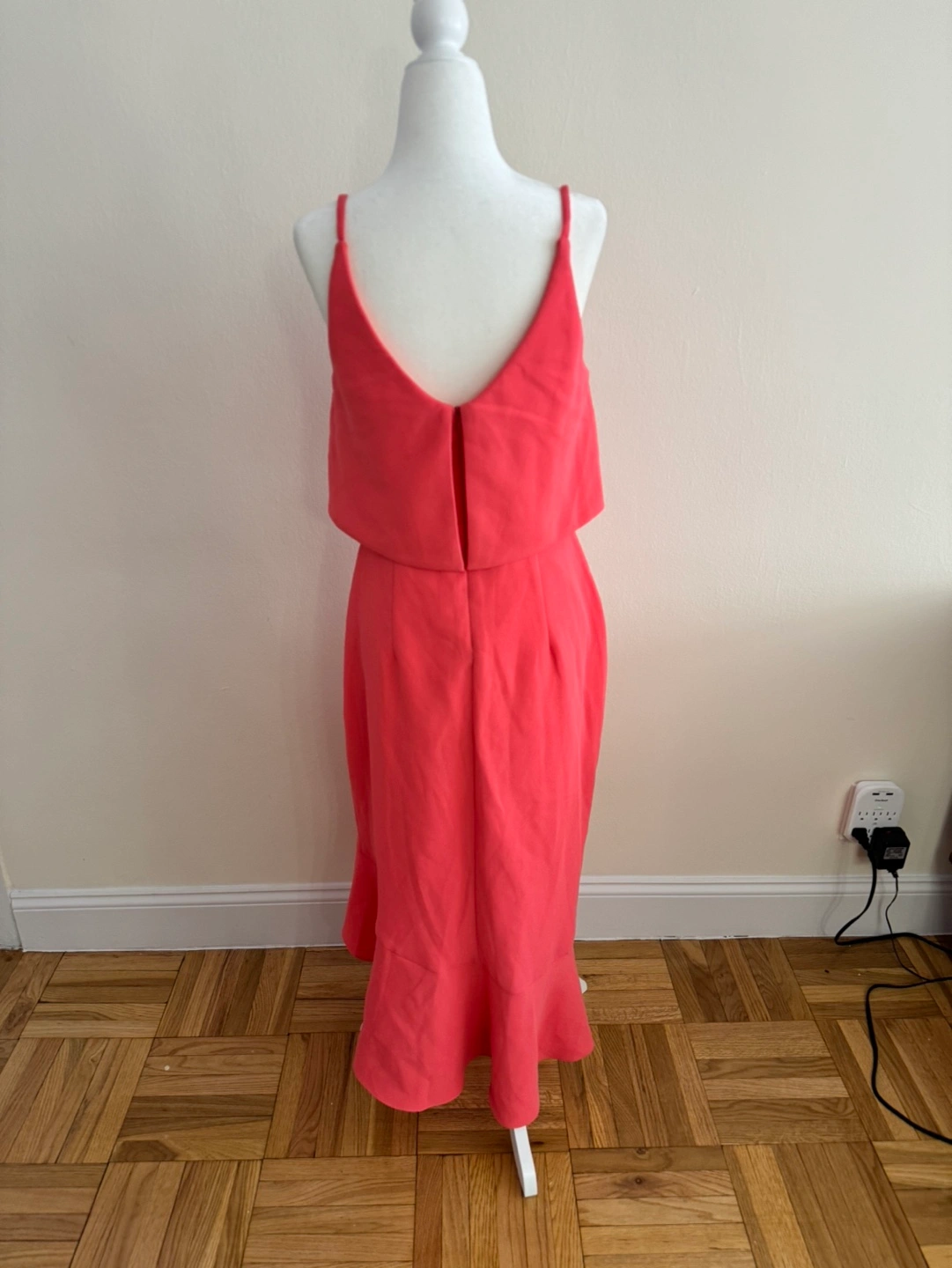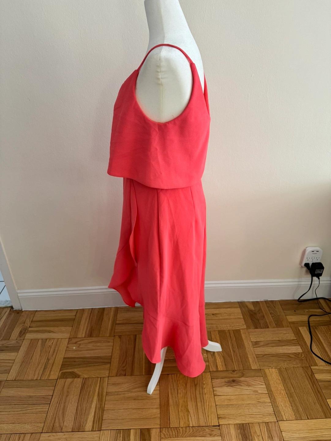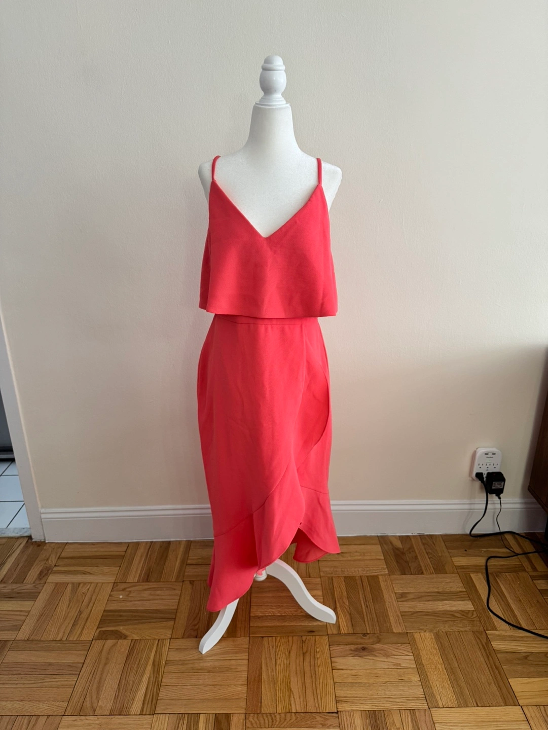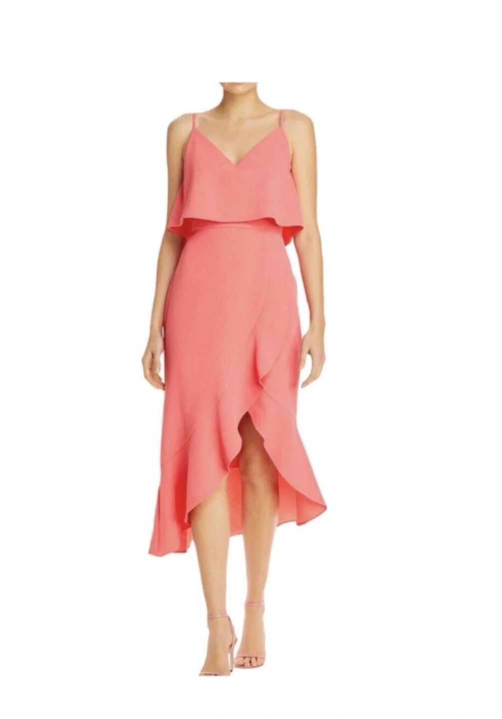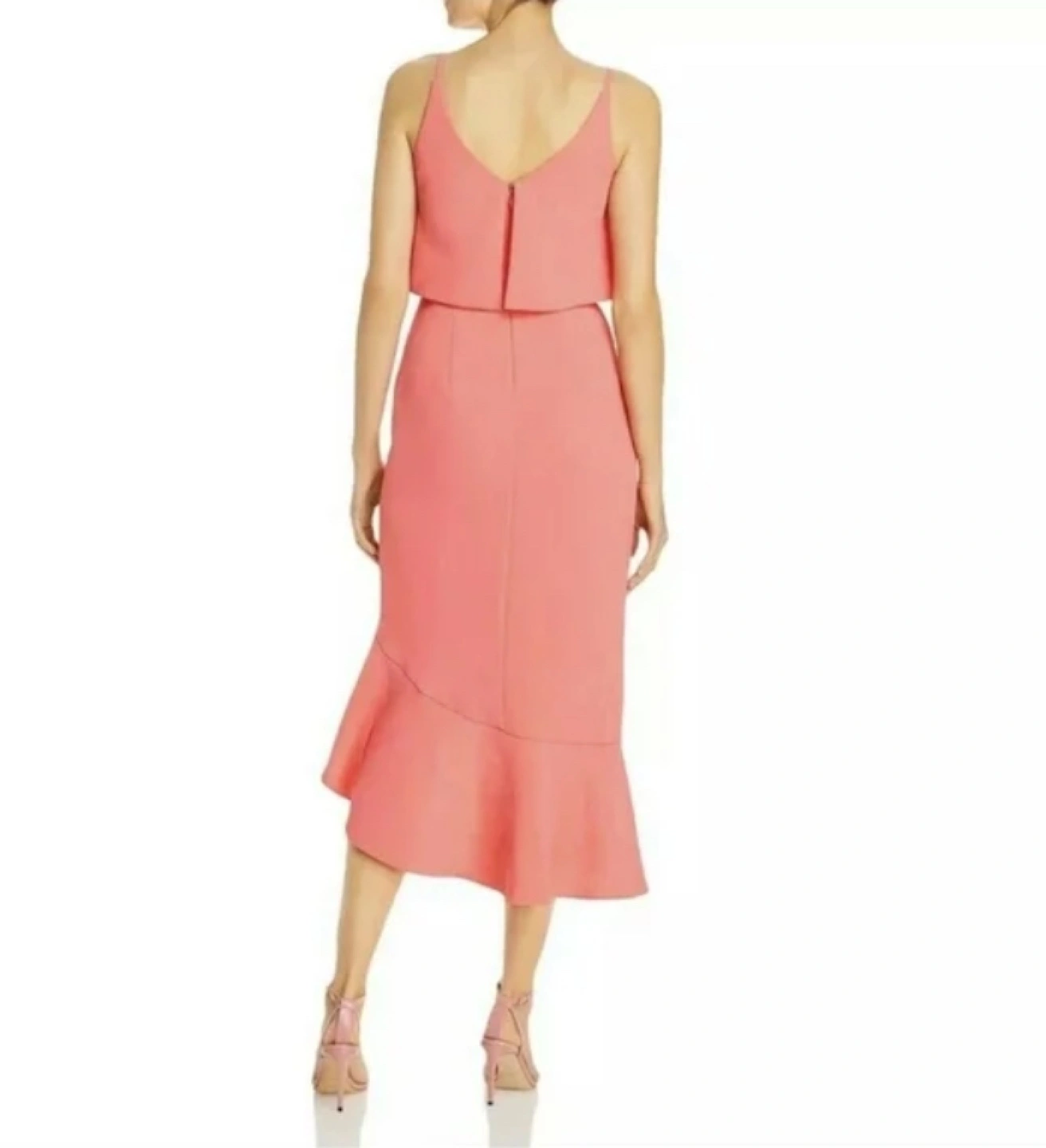 Beautiful coral pink midi dress. Features a V-neckline, spaghetti straps, and a high-low asymmetrical hemline. A ruffled peplum detail adds a touch of elegance. Perfect for a wedding, party, or special occasion.