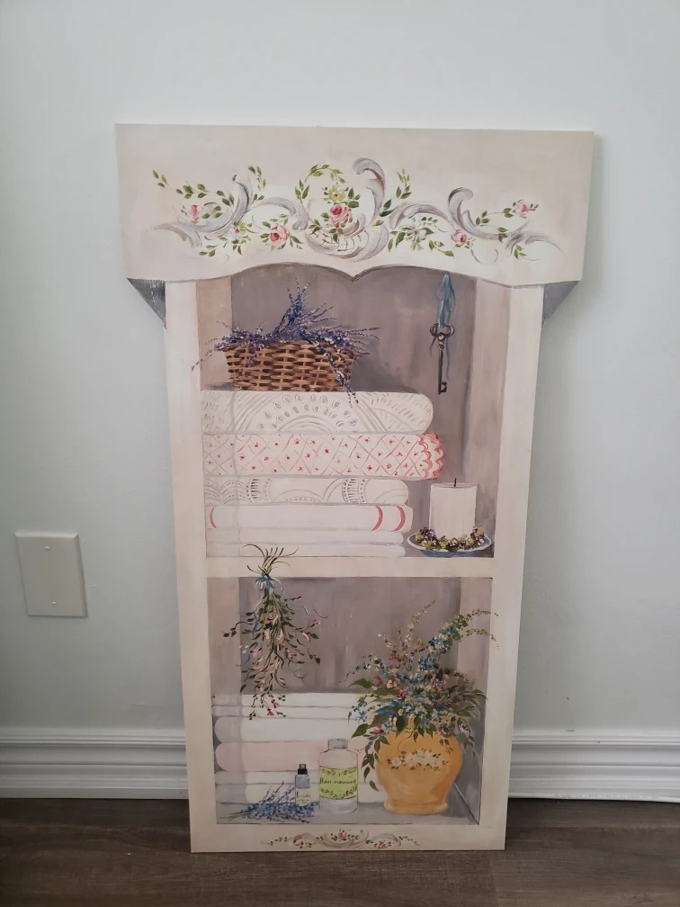 Lovely hand-painted wall art depicting a linen closet. Features a two-shelf design with lavender, towels, and a candle. Ornate detailing and floral accents. Adds a touch of French country charm to any room.