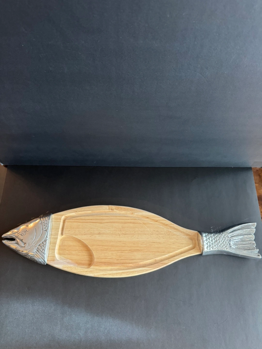 Wooden serving board shaped like a fish. Metal head and tail. Great for cheese, crackers or other appetizers. Approximately 25 inches long.