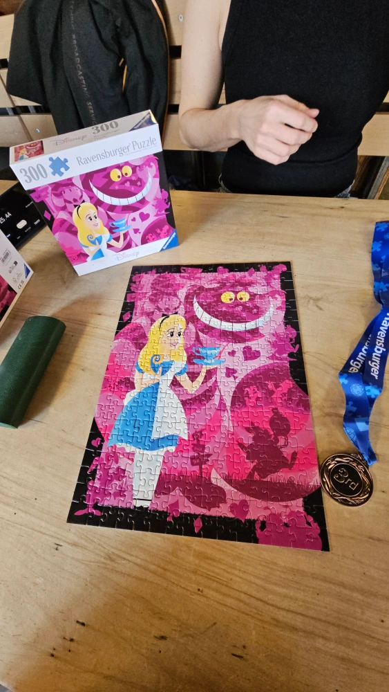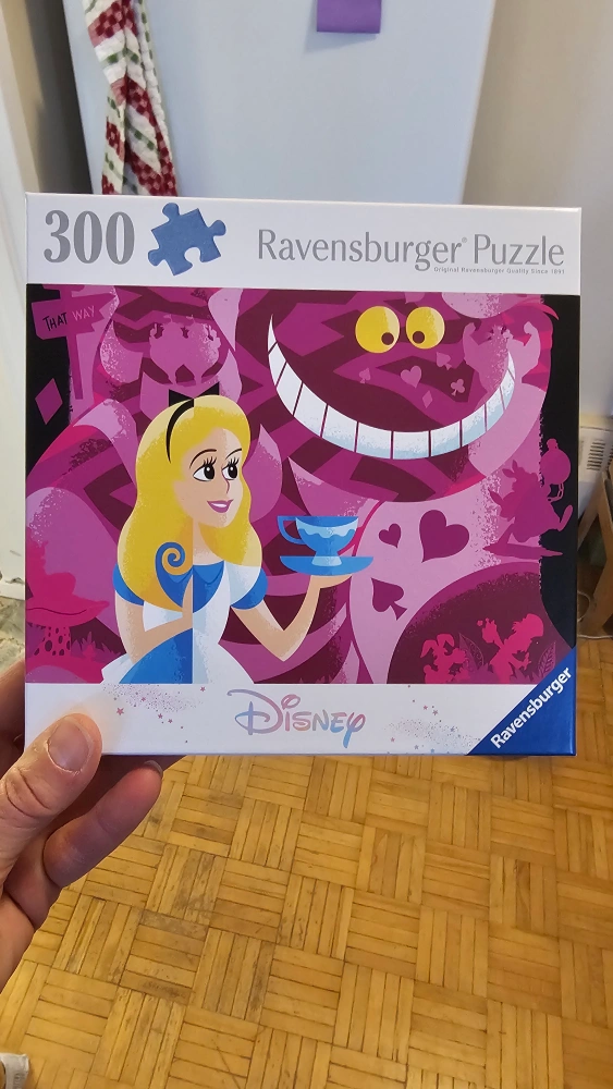 Two complete Ravensburger Disney puzzles. One features a bookshelf filled with Disney characters, 100 XXL pieces. The other is Alice in Wonderland with the Cheshire Cat, 300 pieces. Both puzzles are in excellent condition.