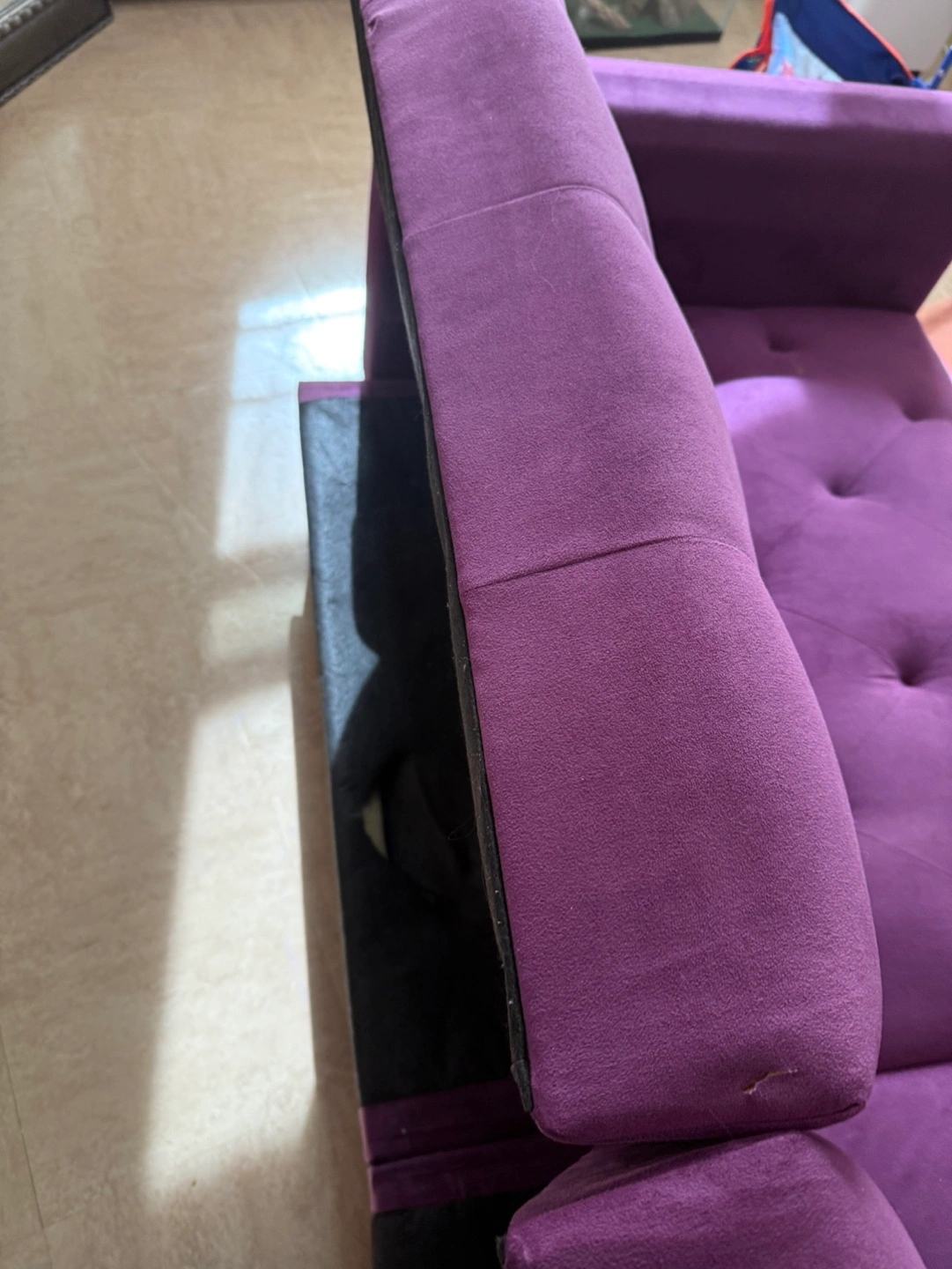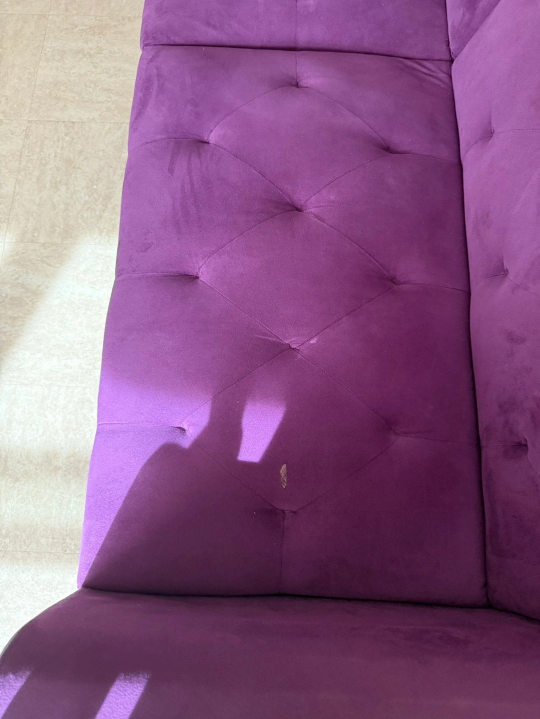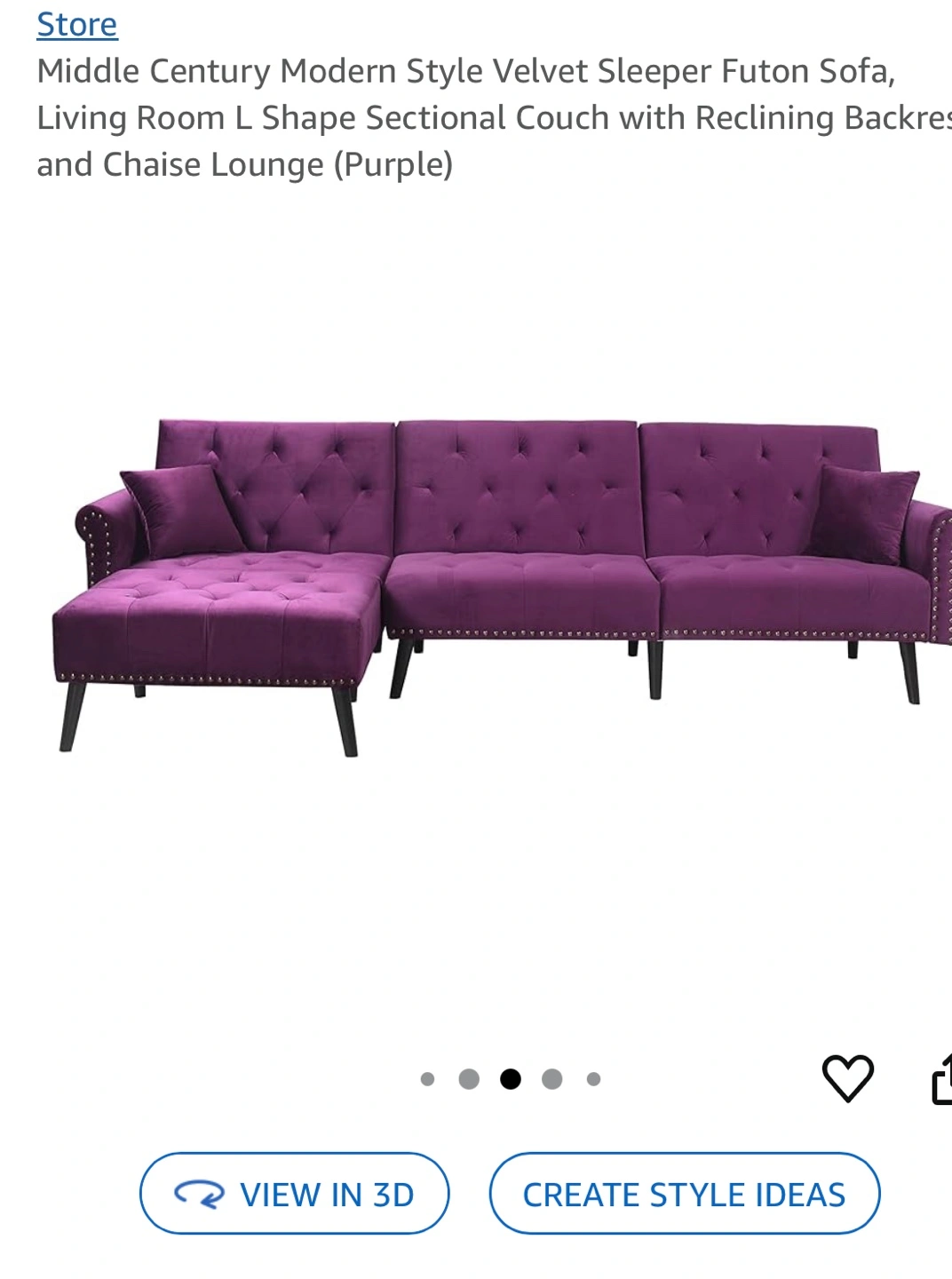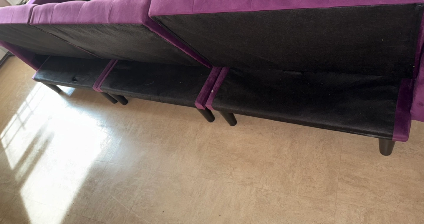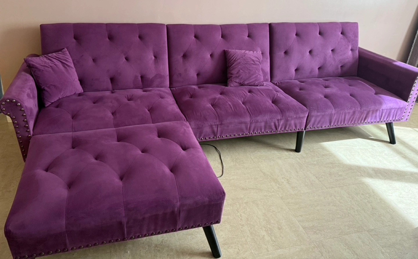 L-shaped futon couch. Purple velvet upholstery. Features button tufting and studded accents. Includes two included pillows. Black legs.