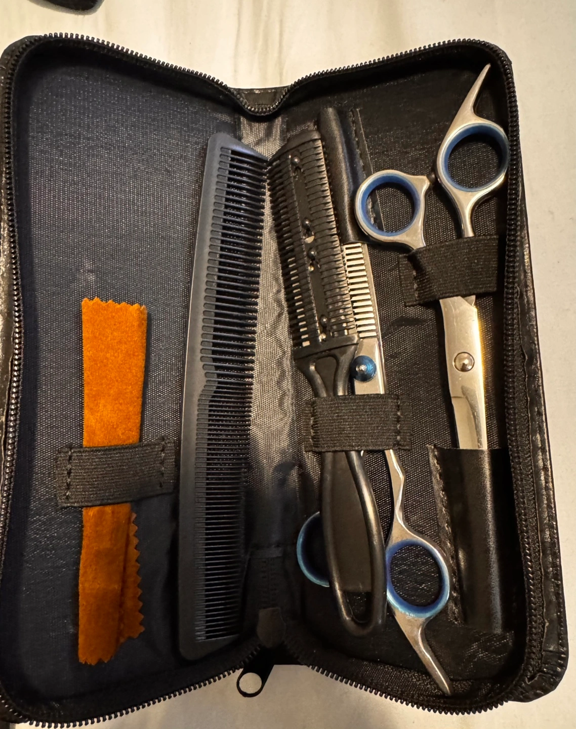 Professional hair cutting kit. Includes two pairs of shears, two combs, and a cleaning cloth. All items stored in a black carrying case.
