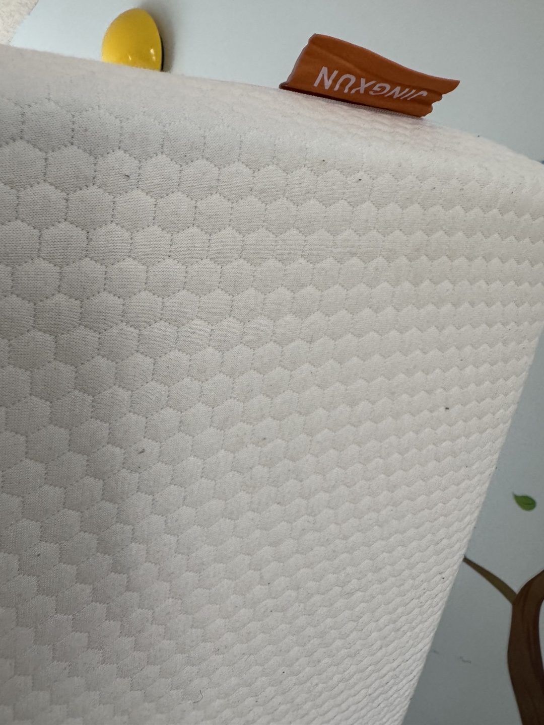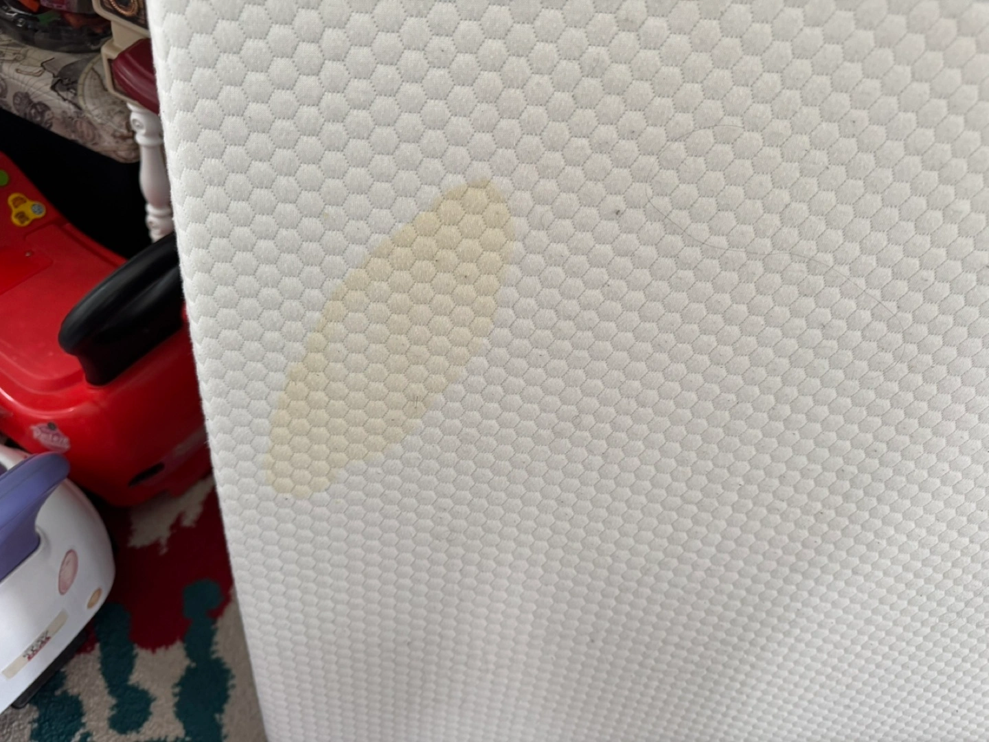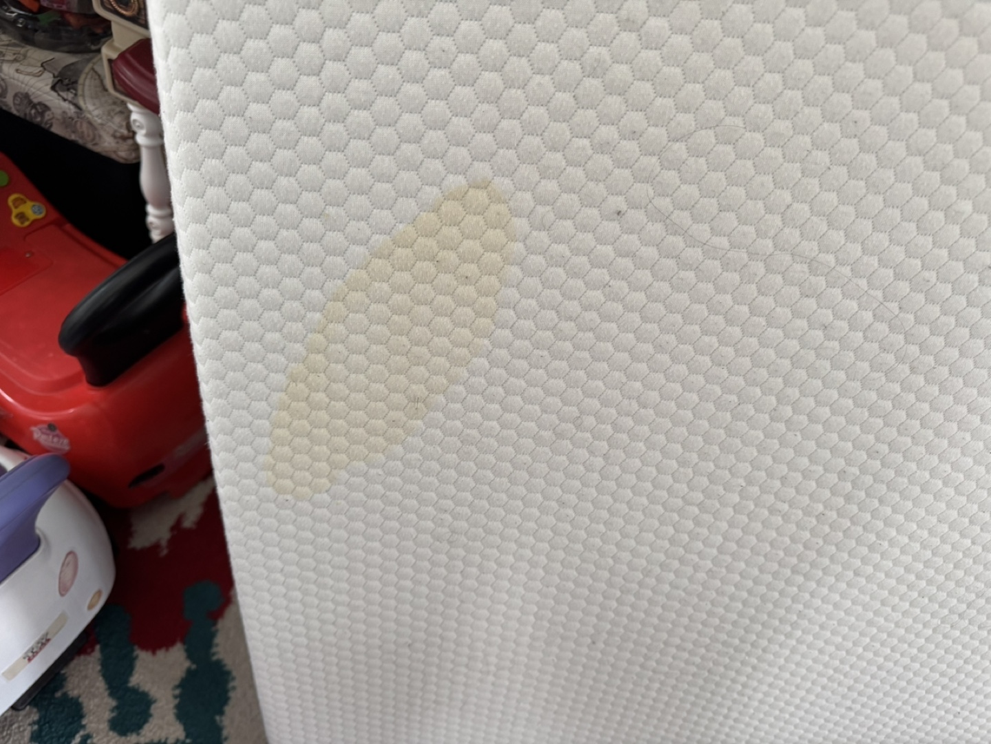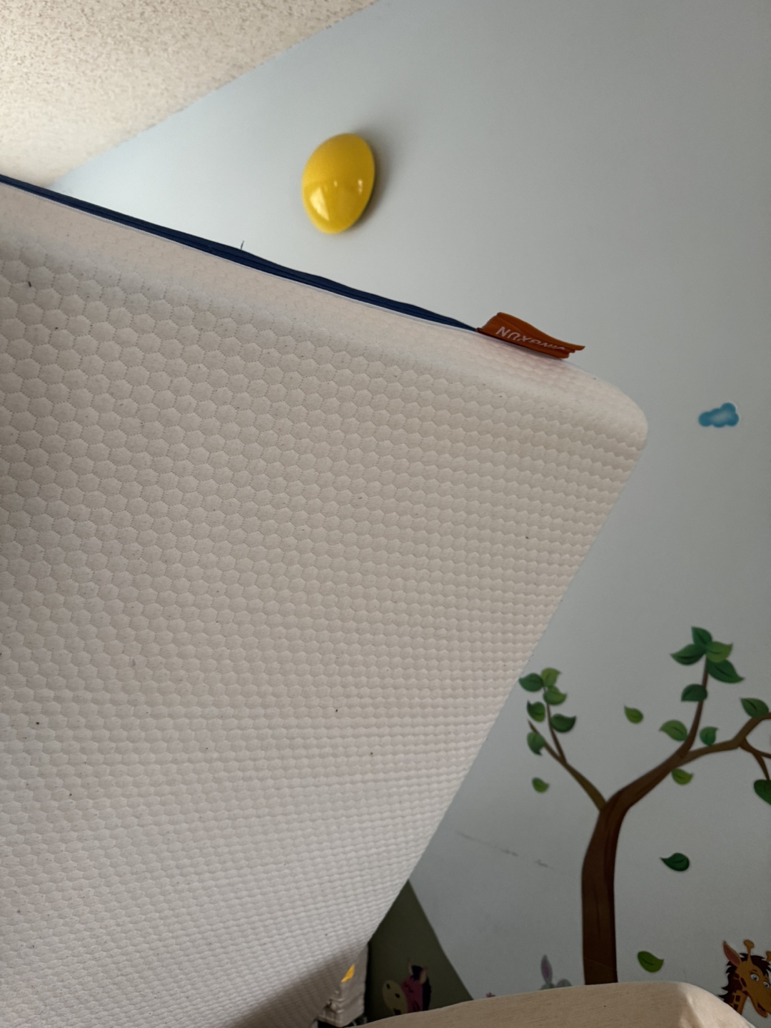 Twin mattress, shows some minor stains. Used condition. White with navy blue trim.