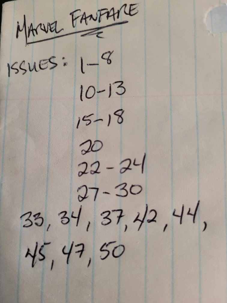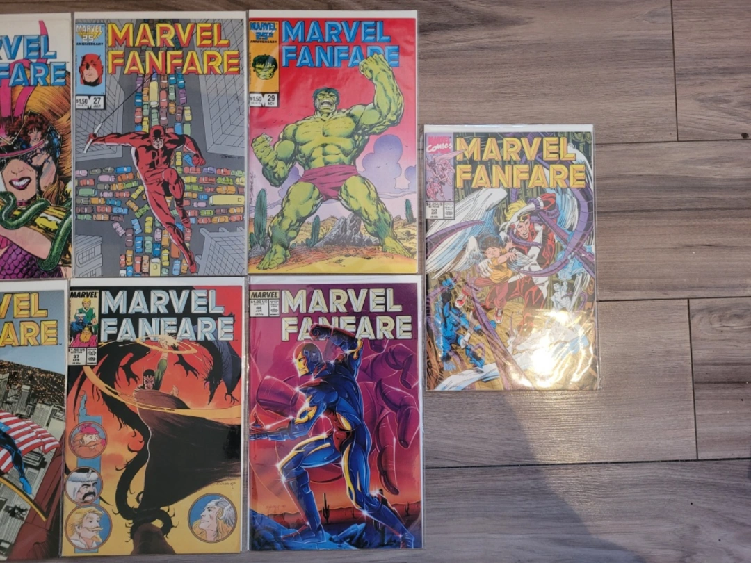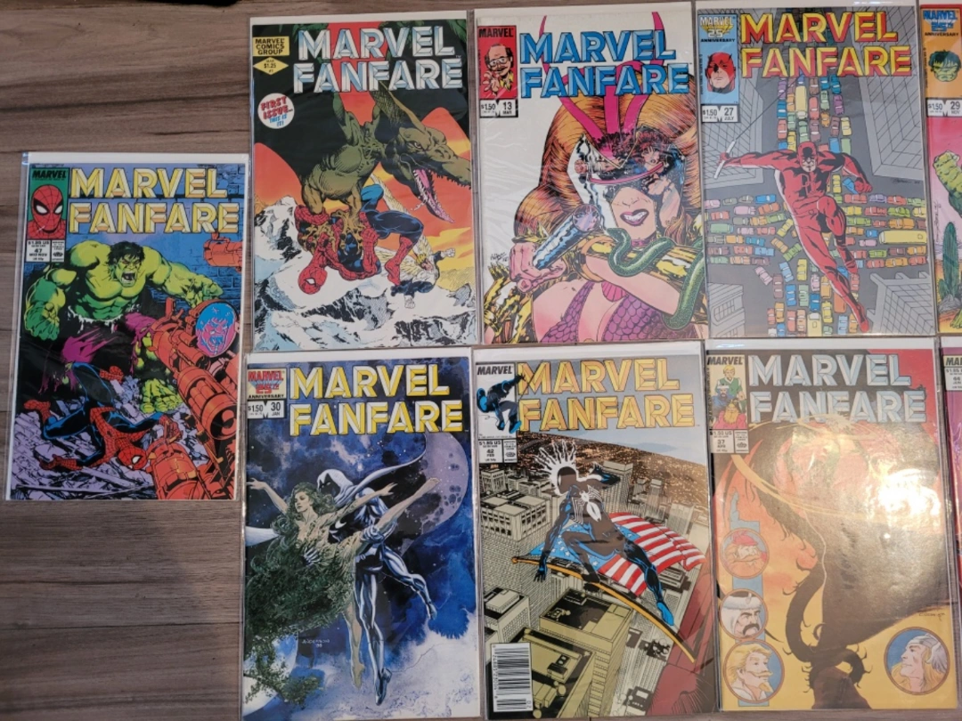 Collection of 32 Marvel Fanfare comic books starting from 1982 (1st series). Issues include 1-8, 10-13, 15-18, 20, 22-24, 27-30, 33, 34, 37, 42, 44, 45, 47, 50. Various covers featuring different Marvel characters. Conditions are mostly F or VF.