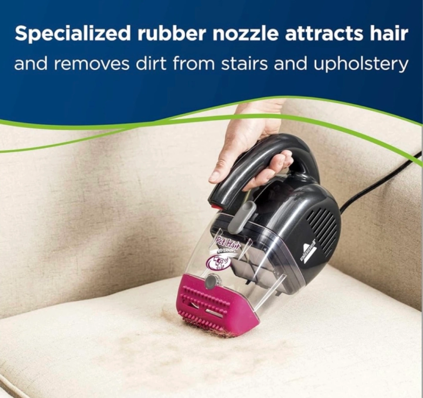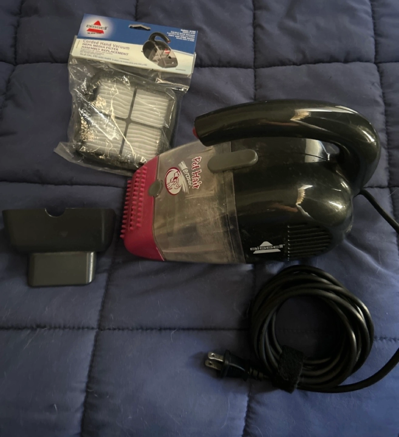647Used Bissell Pet Hair Eraser handheld vacuum (not cordless), includes extra filter and extra nozzle. Great for pet hair, upholstery, stairs, and cars.