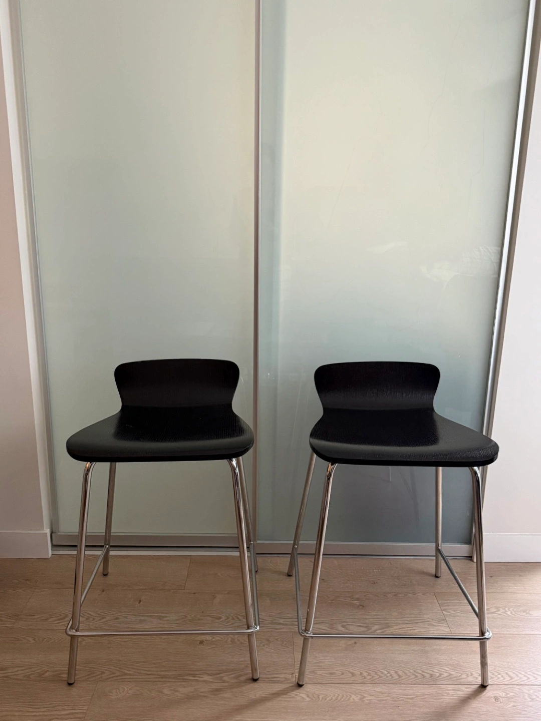 Set of two contemporary bar stools. Black wood seats and chrome-plated metal legs. Sleek and modern design. Ideal for kitchen island or bar.