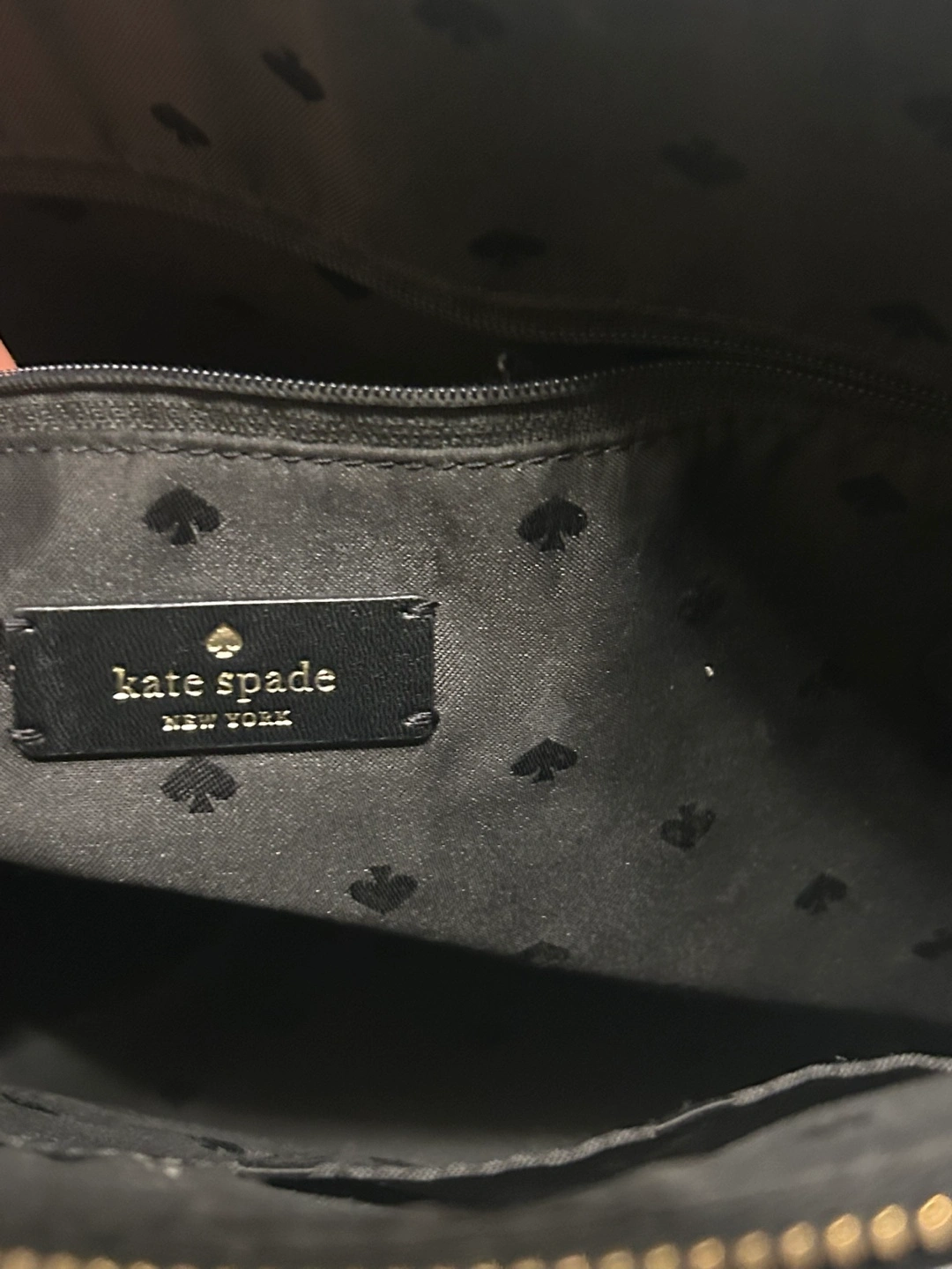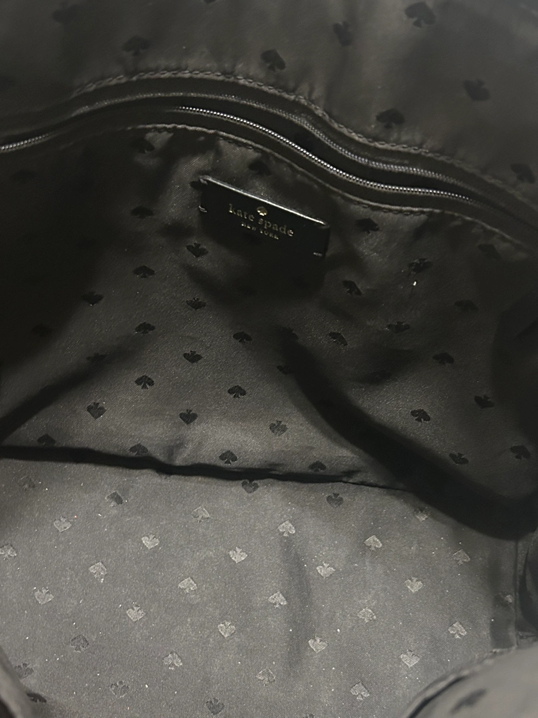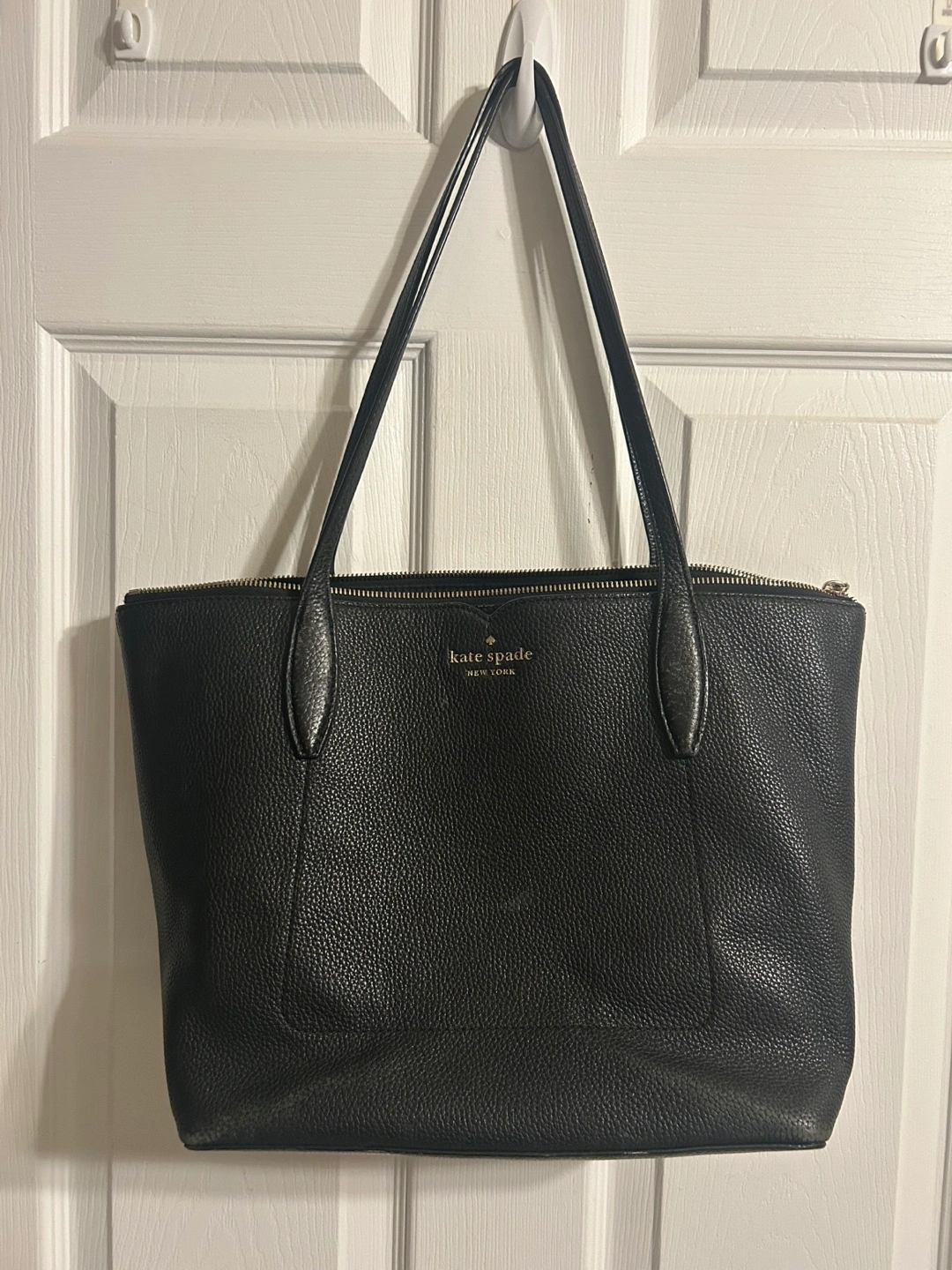 Black leather tote bag. Top zip closure. Minor wear and tear visible on the leather. Can be shined up with some mink oil