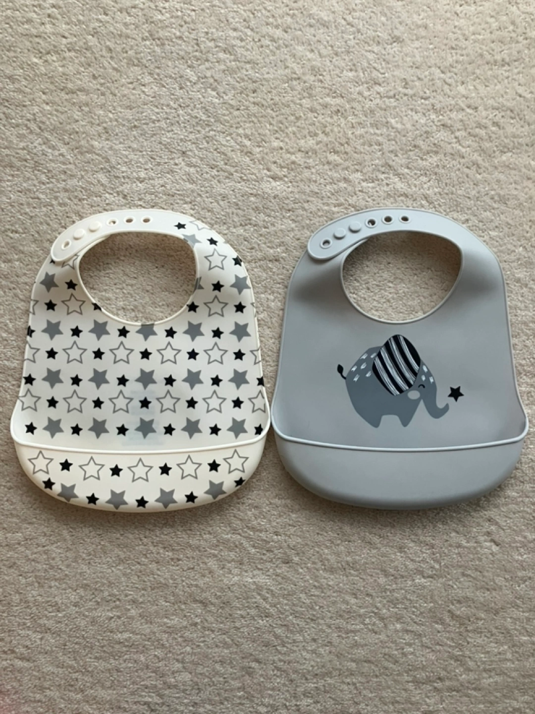 Two adorable silicone baby bibs. One features a star pattern, the other an elephant design. 100% silicone, BPA, PVC and phthalate free. Dishwasher safe.