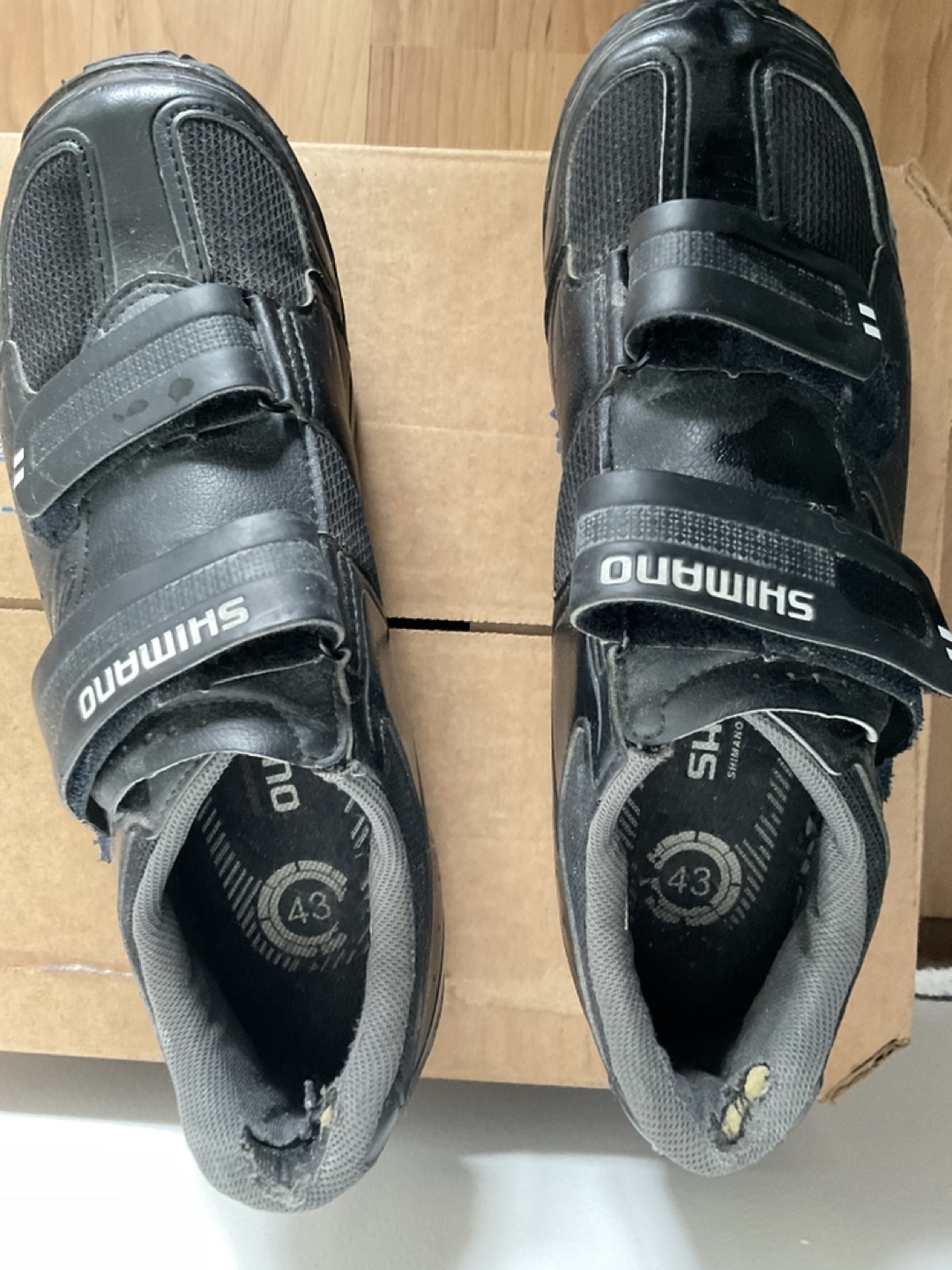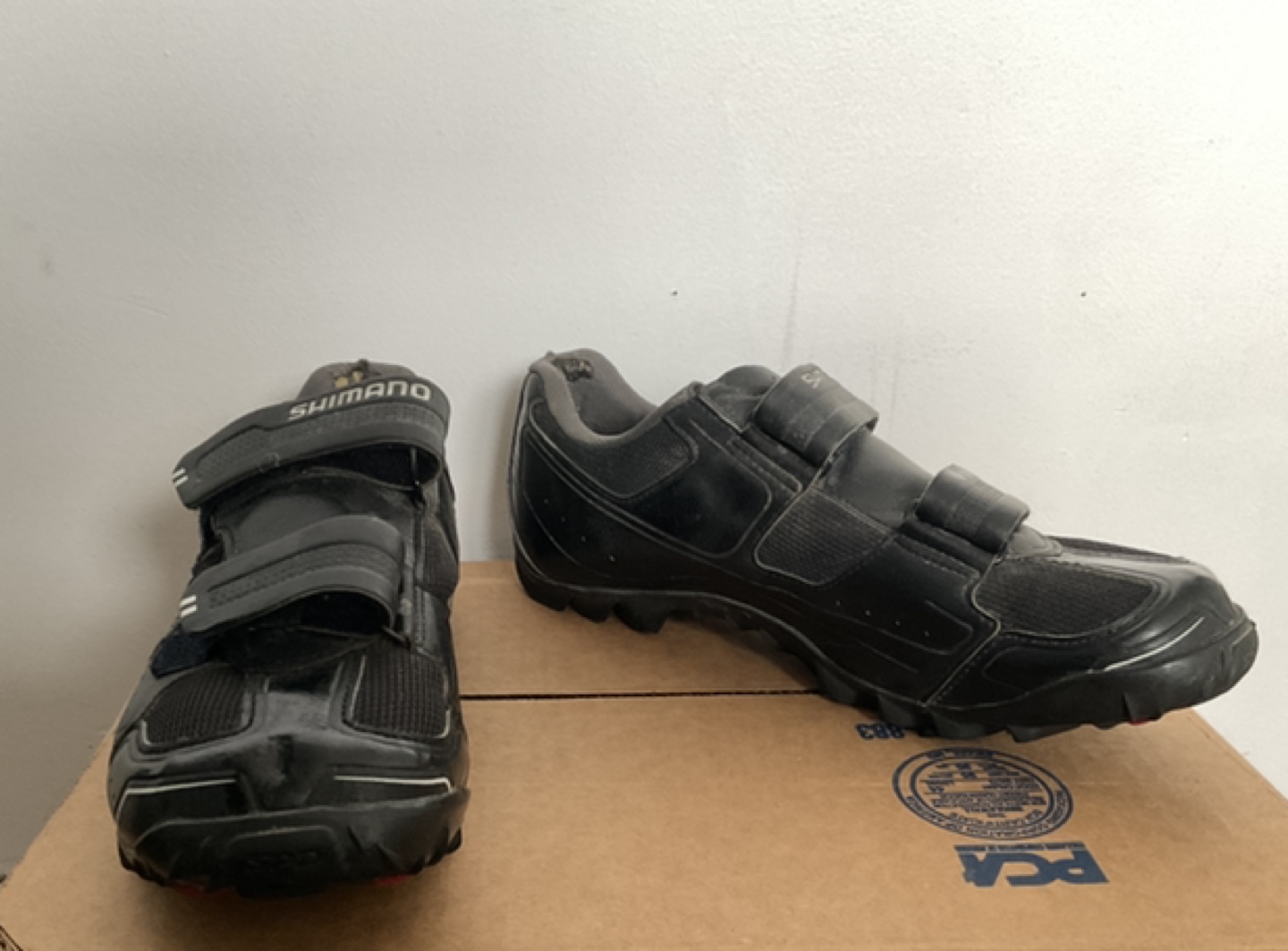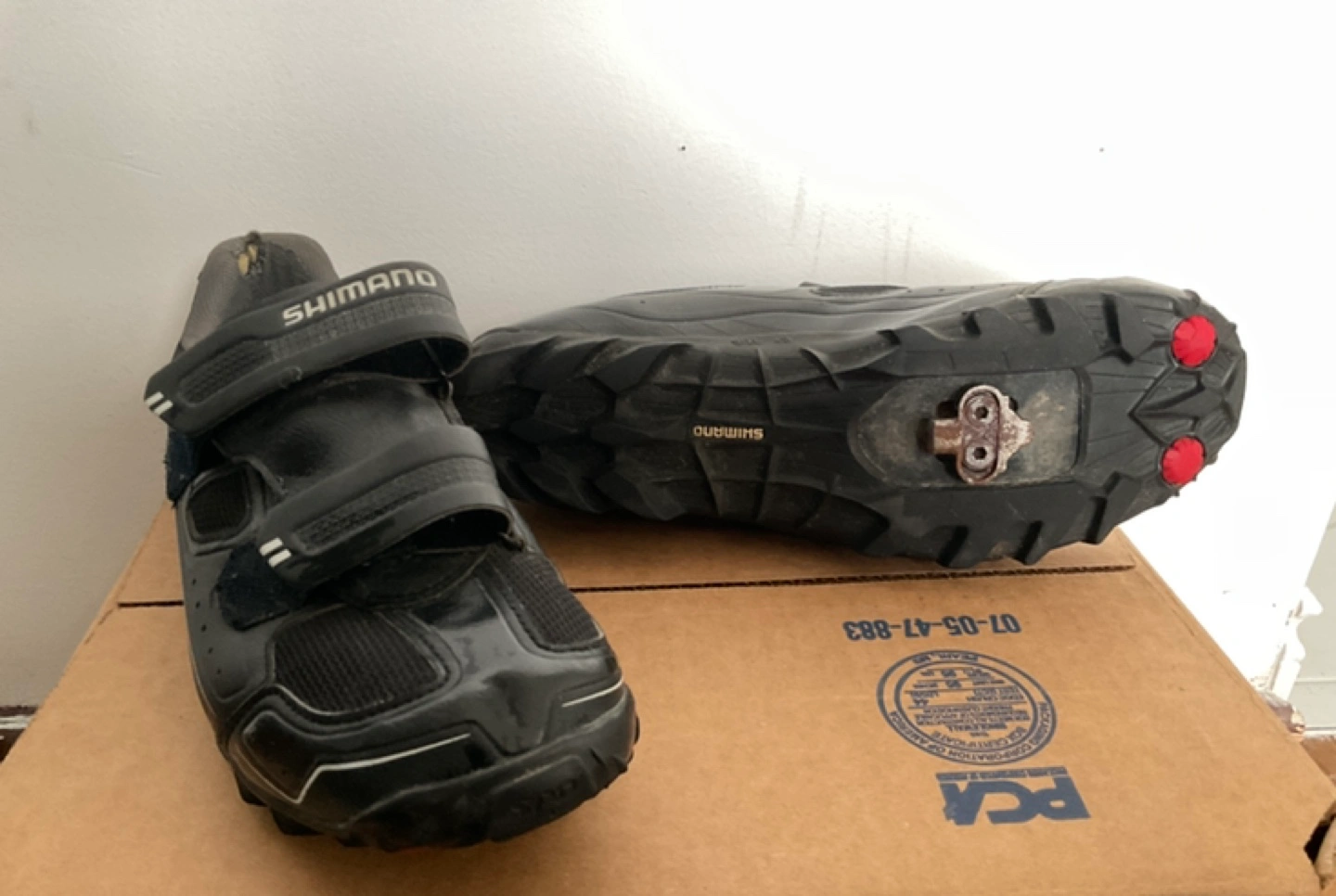Shimano mountain bike shoes with SPD cleats. There’s just some wearing on the heel area, otherwise good condition, no smell. cleats might be a bit rusty on there but they are still pretty new and will last a while . Size 43 mens