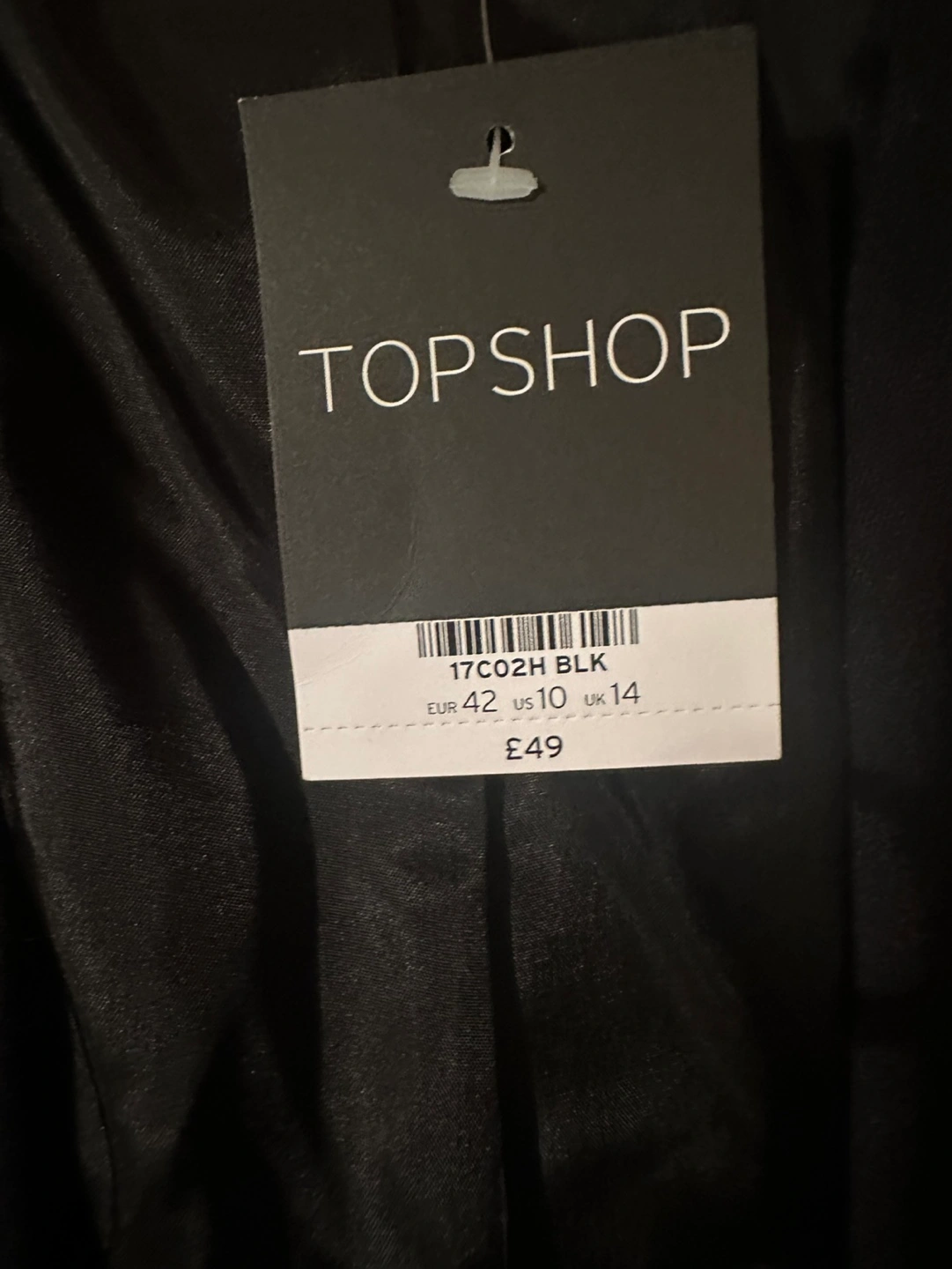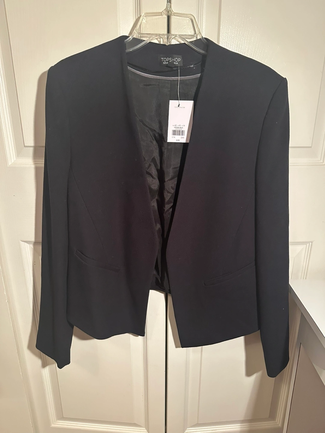 Brand New Top Shop Black Blazer in US10 and with an open front. This is structured and a neutral piece that you could dress up or dress down. This blazer has never been worn and has original tags attached.
