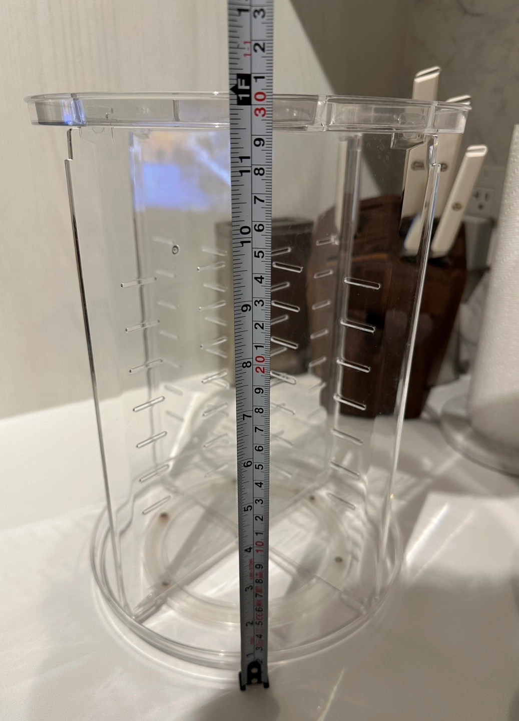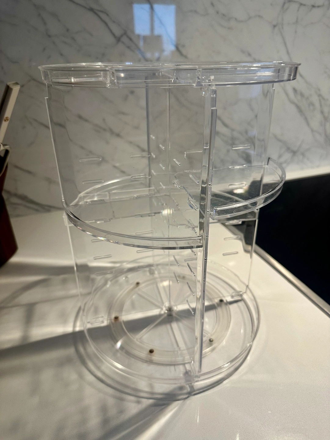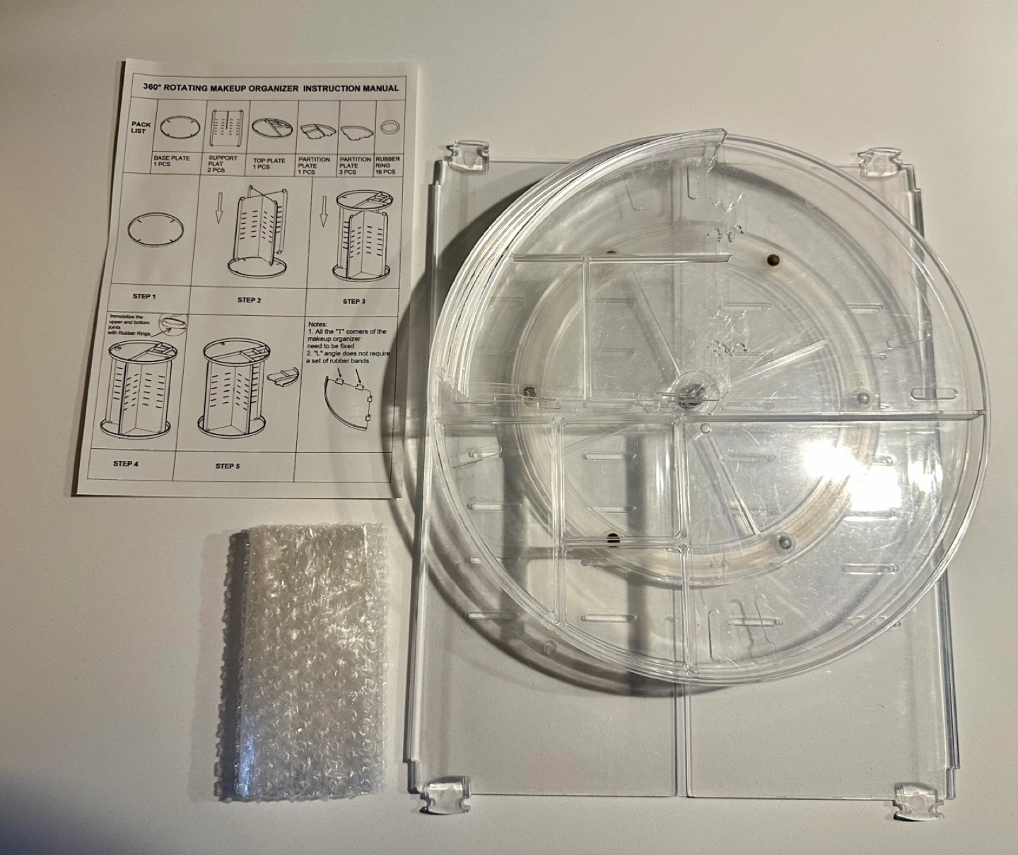 Clear acrylic makeup organizer. Rotating design. Includes all parts and instructions. Easy assembly. 16 rubber rings included.