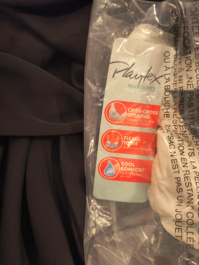 Brand New Playtex nursing bra. pack of two. Criss-cross opening, flexes to fit your changing body, cool comfort fabric. Fits Size 36D, 36DD, 38C, 38D (See picture).