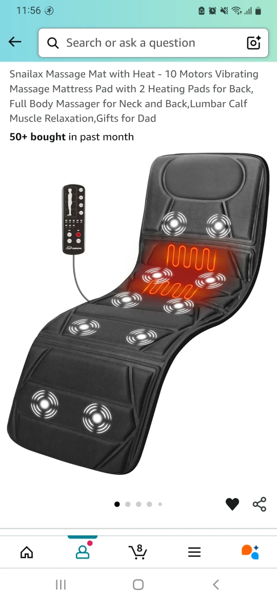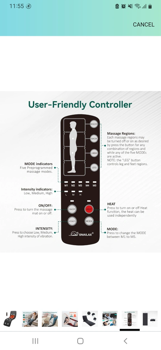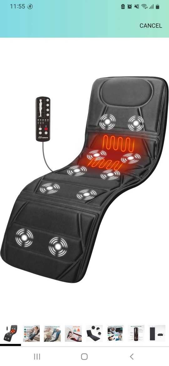 Full body massage mat. Ten motors. Two heating pads. Great for neck, back, lumbar, and calf muscle relaxation. Includes remote control.
