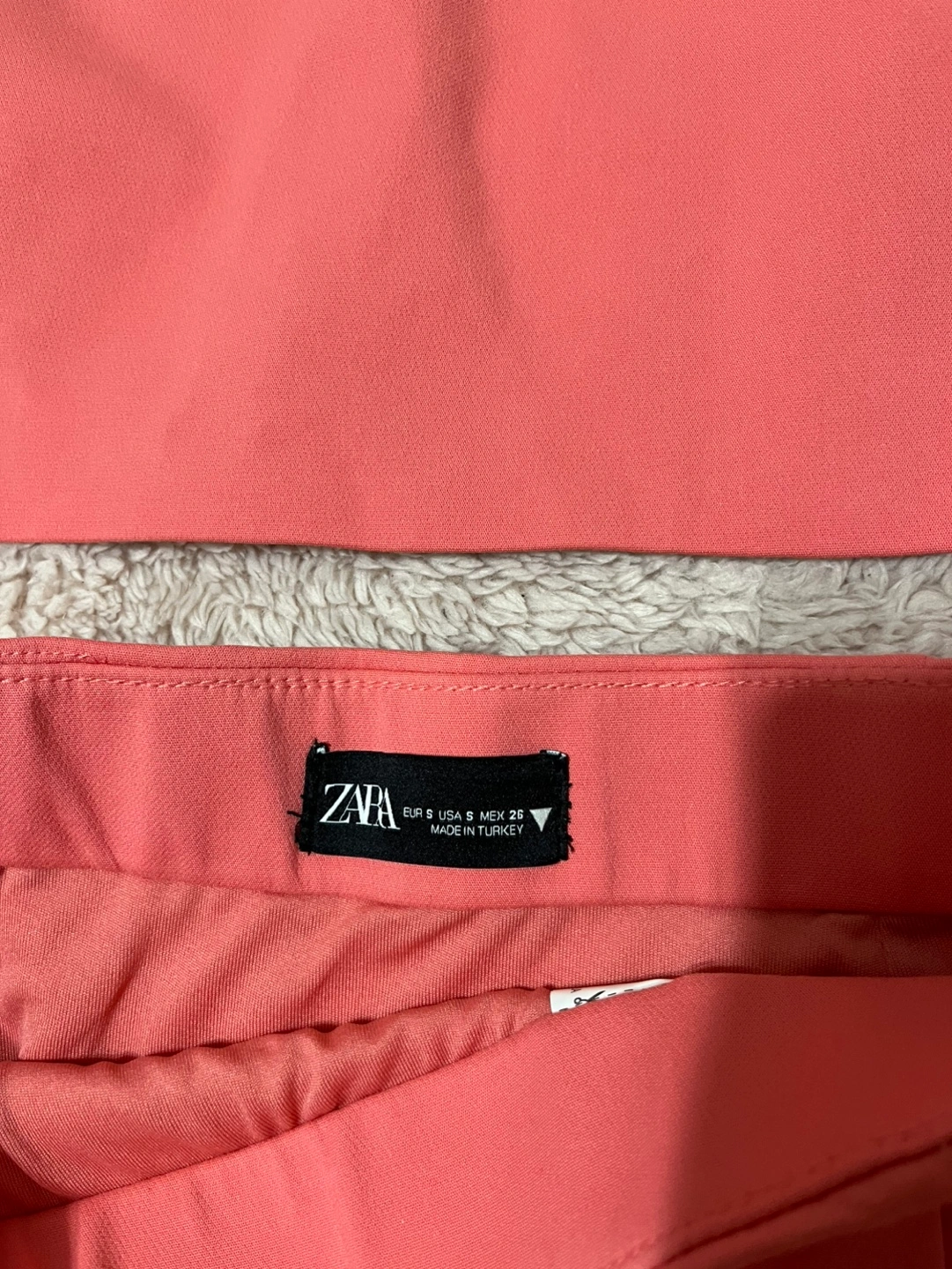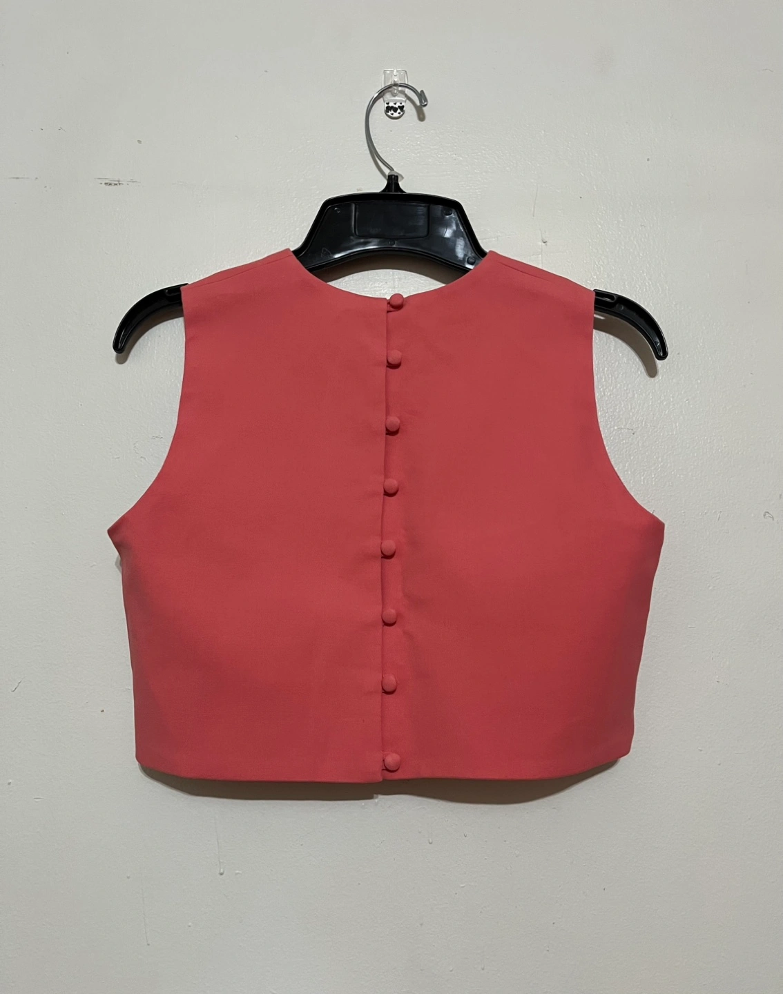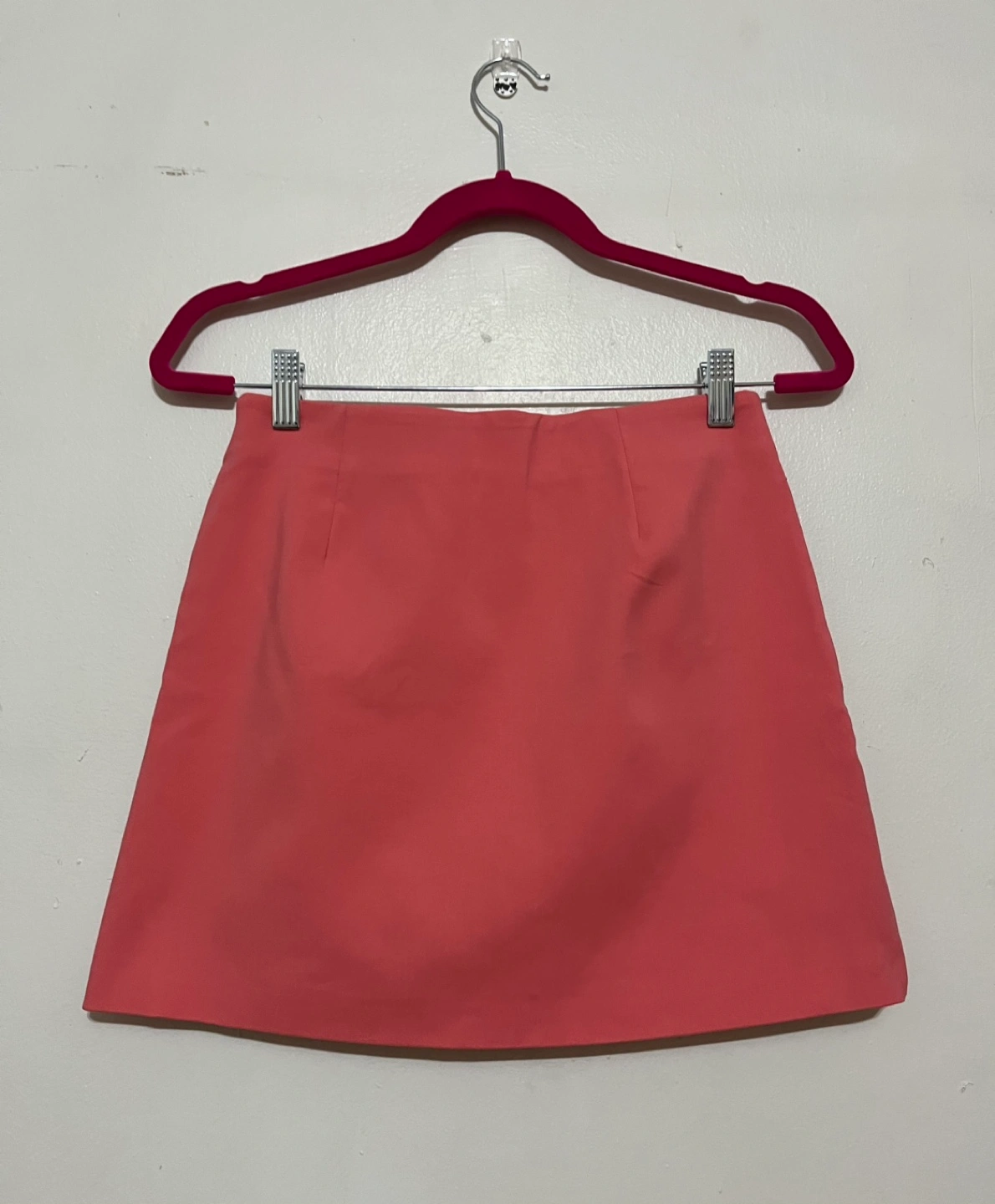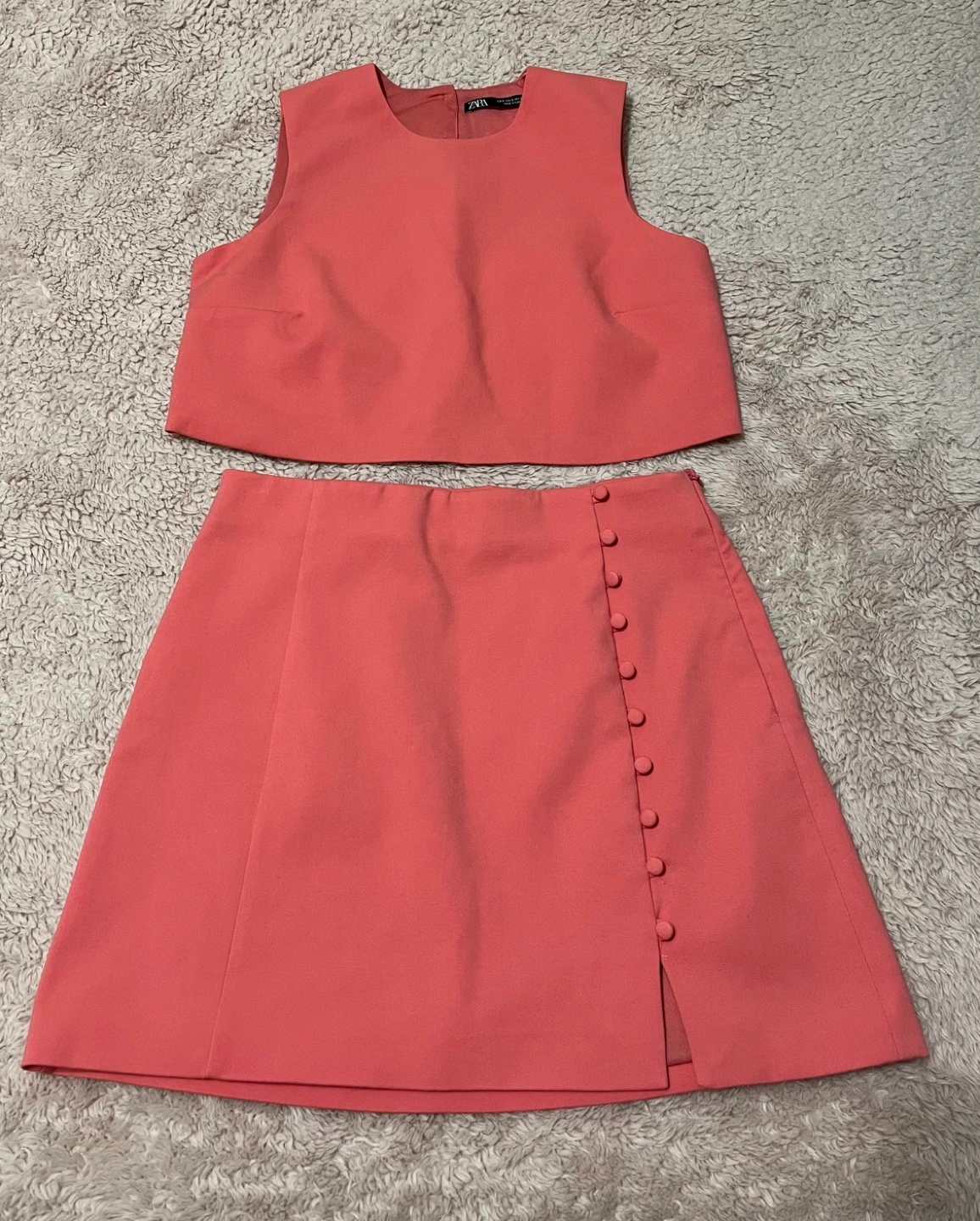Salmon pink matching set. Includes sleeveless cropped top and A-line mini skirt. Side button detail on skirt. Size small.