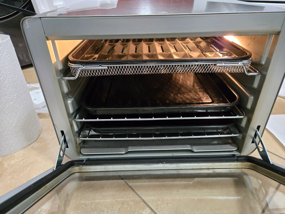 It includes 2 sheet pans, 2 wire racks, and air fry basket, roast tray, 15-receipe tray, and crumb tray.