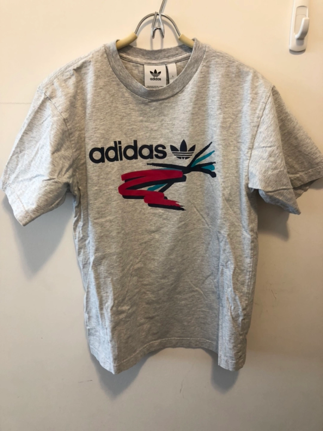 Grey Adidas t-shirt. Large size. Features a colourful graphic design on the front. Made in China. Cash/E-transfer only First come first serve Deals if combined with my other listings