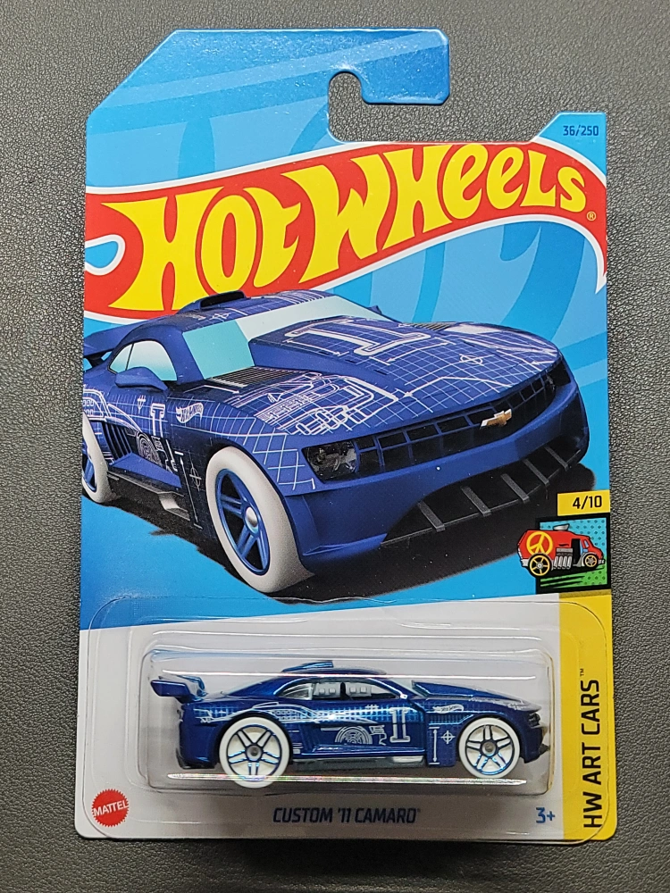 39Collectible Hot Wheels die-cast car. Blue Camaro design. Part of a 10-piece set. Number 4 of 10.