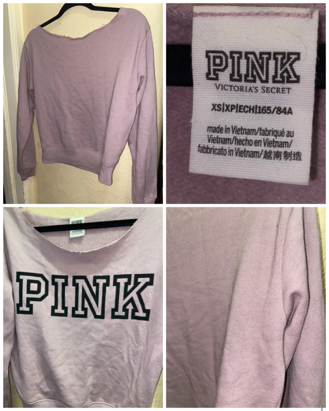 Description for each items B. PINK Fleece cropped sweatshirt szXS -$20 Description Condition- has been worn. In very good condition. Size- xsmall Colour- neutral tone purple Brand- Victoria secret PINK C. PINK VS oversized t shirt szXS - $20 Check out this PINK Victoria’s Secret oversized T-shirt in size XS! It features a pocket on the front with ‘PINK’ embroidered and a larger silver logo on the back, perfect for a comfy, casual look. This shirt has been previously loved, so it’s in used condition. Key Features: - Brand: PINK Victoria’s Secret - Size: XS (Extra Small) can fit small - Style: Oversized T-Shirt - Colour: Purple - Front pocket with ‘PINK’ embroidery - Large silver ‘PINK’ logo on the back Condition- in good condition and shape. Has No Rips. No stains. No wear or tear D. PINK oversized t shirt szS -$20 Condition- in good condition and shape. Has No Rips. No stains. No wear or tear Colour- purple and black logo Size- Small ( fits oversized and long can fit medium) Material- cotton Cash Payment Only No Refunds / Exchange No try ons, No trading, No holds. All purchases are Finally Sale From a Smoke Free home Fast pick up Confirmed Price-$20 for each item A. SOLD Pick up-Only at TTC Station- Coxwell subway station Located In East York, Toronto