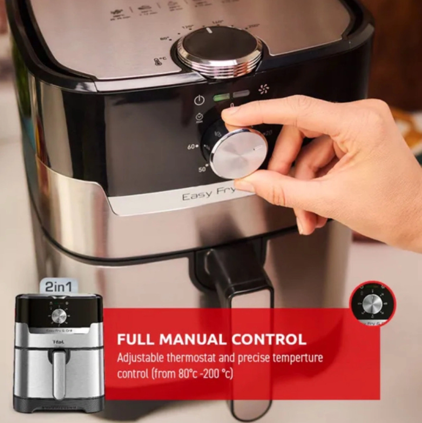 At your control: Adjustable thermostat and precise temperature (from 80˚C-200˚C).