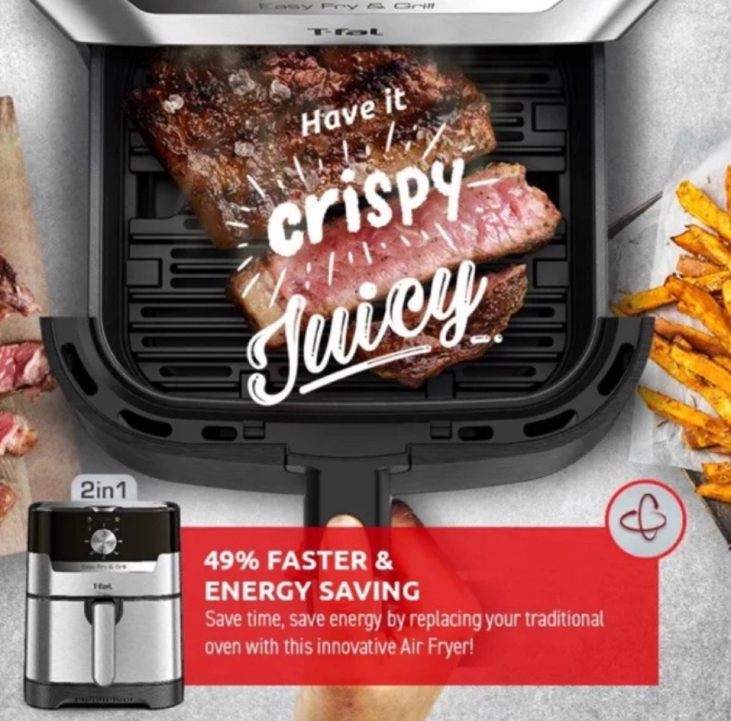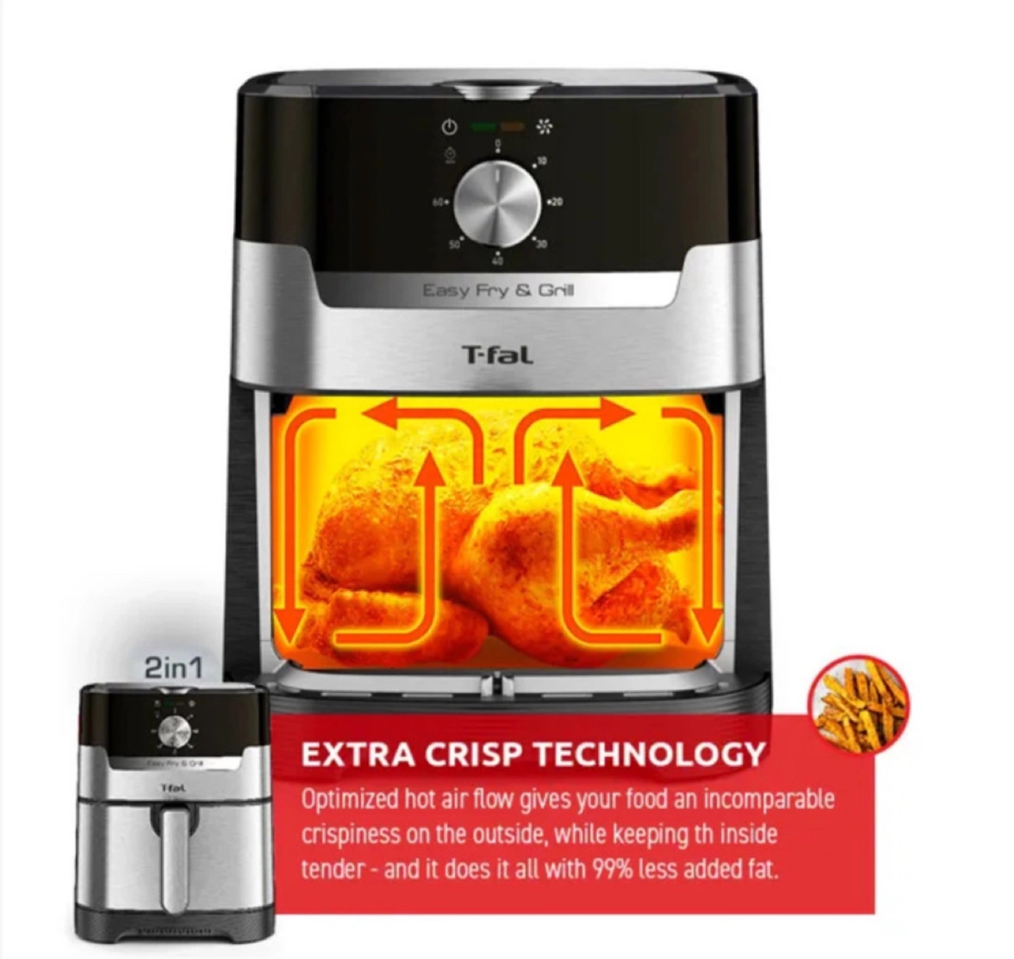 Extra Crisp Technology: Extra Crisp Technology: Optimizes hot air flow to give your food an incomparable crispiness on the outside, while keeping the inside tender - 99% less added fat**.