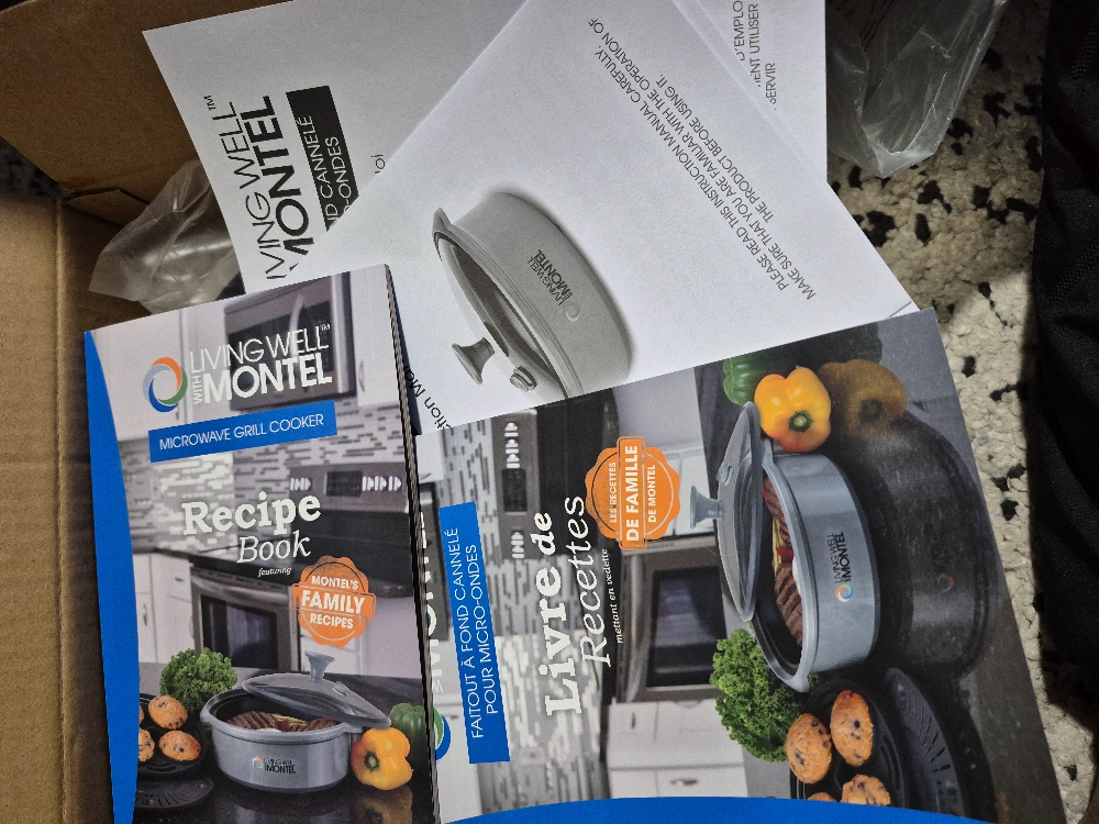 Microwave grill cooker, grey. Includes recipe book featuring family recipes. New, in box. Instruction manual included. open box