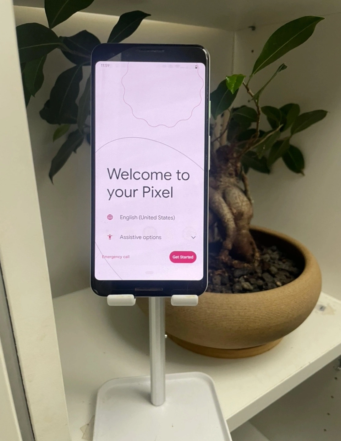 Google Pixel 3, 64GB in white. Setup screen shown. Android version 12. Includes phone and charger.