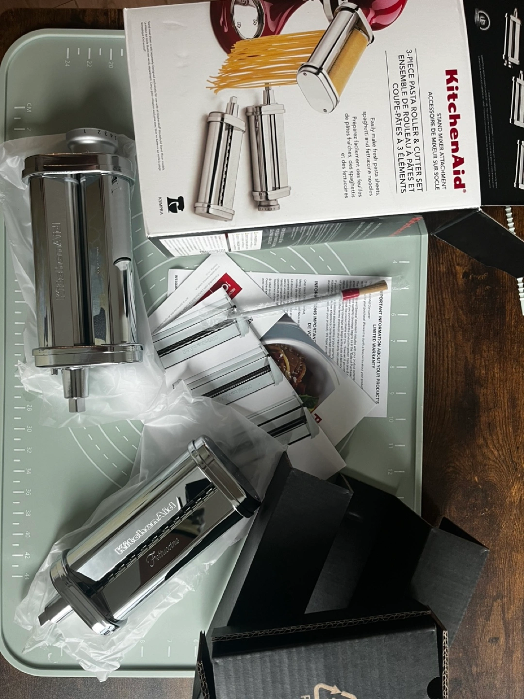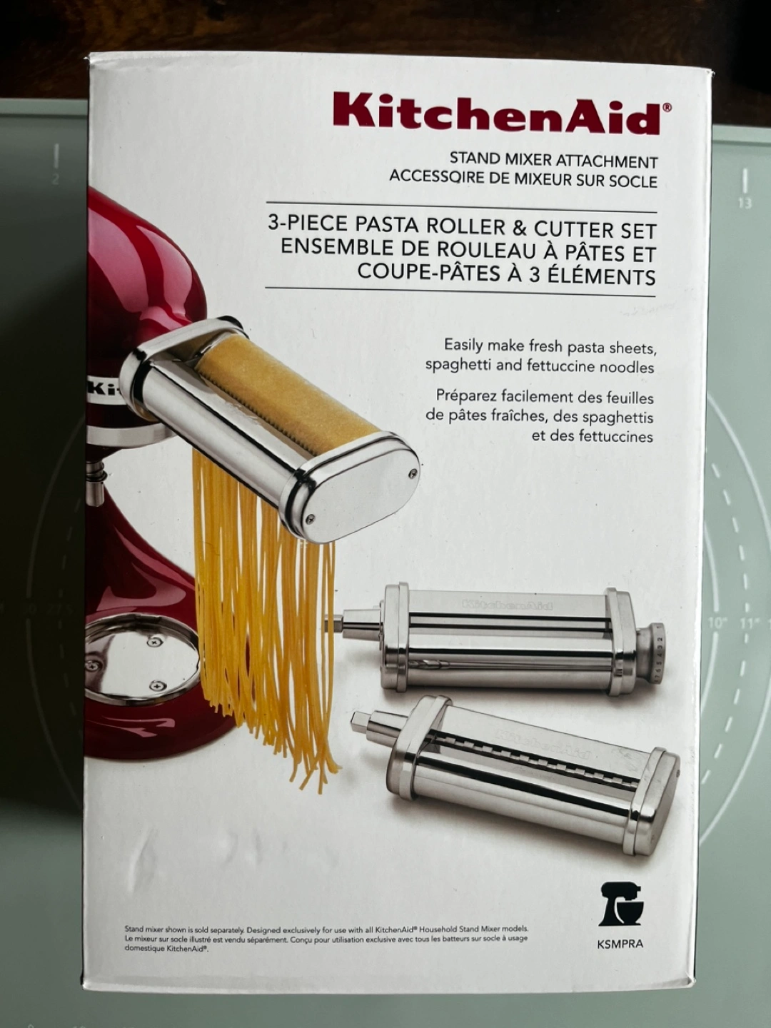 263Brand new in box. Never used Makes fresh pasta sheets and fettuccine noodles. Spaghetti cutter missing. Chrome finish. Designed for use with KitchenAid stand mixers. Includes roller, cutter and instructions. https://www.kitchenaid.com/countertop-appliances/stand-mixers/attachments/p.3-piece-pasta-roller-and-cutter-set.ksmpra.html