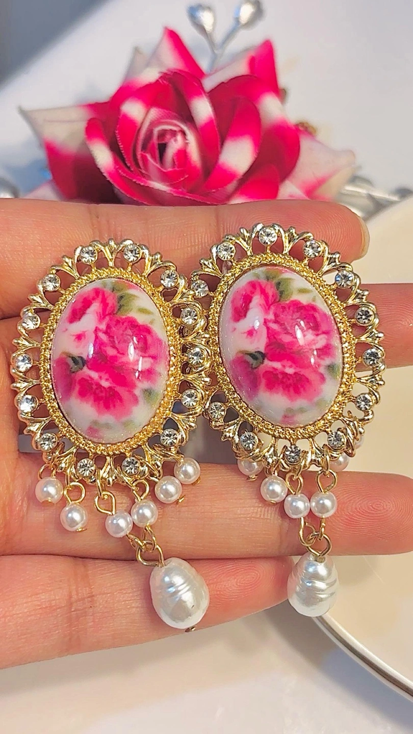 Elegant gold tone earrings. Features oval pink floral design accents. Clear rhinestone embellishments. Pearl drop accents dangle below.