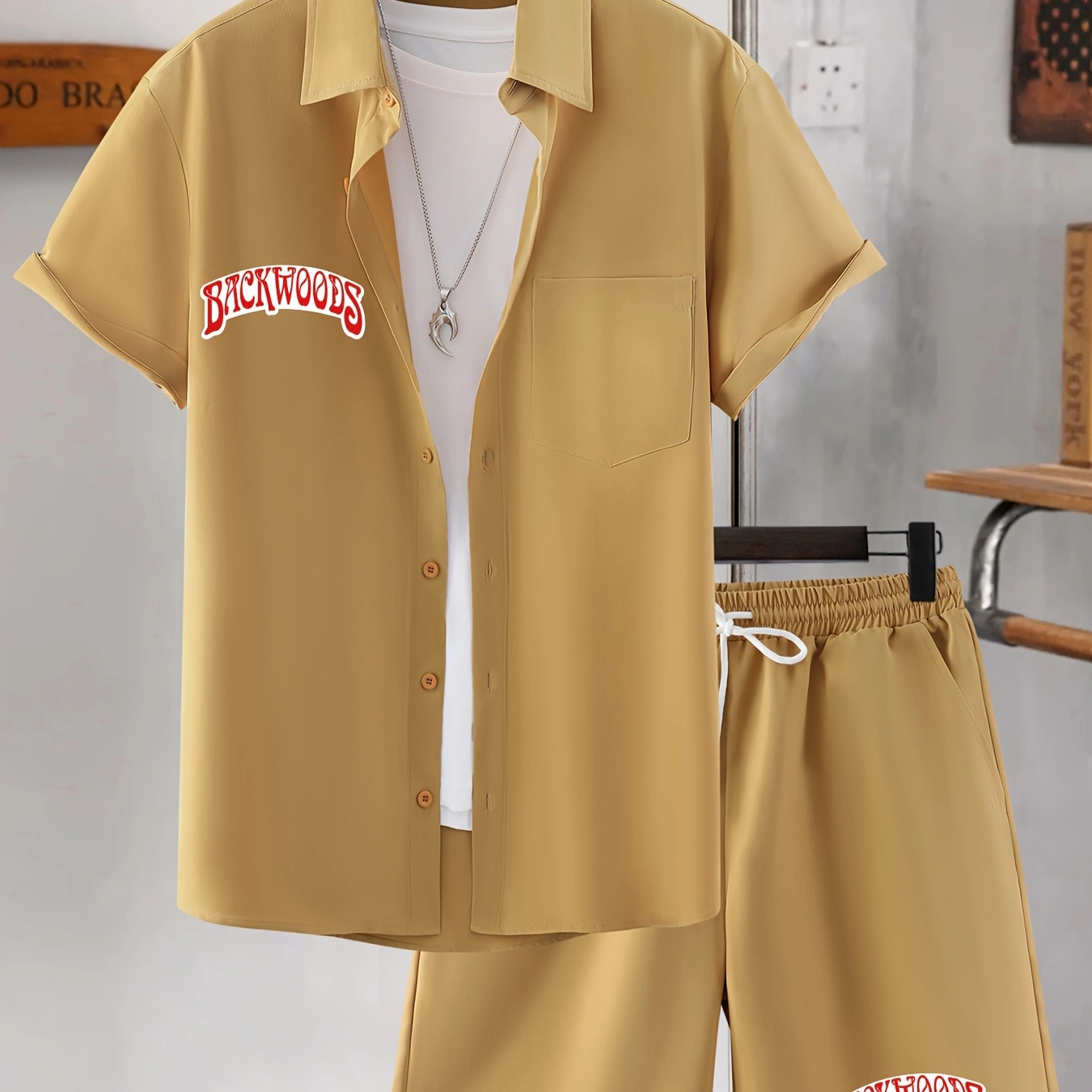 Men's two-piece outfit. Mustard yellow short sleeve button-up shirt and matching shorts. Features Backwoods logo. Relaxed fit. Perfect for summer.