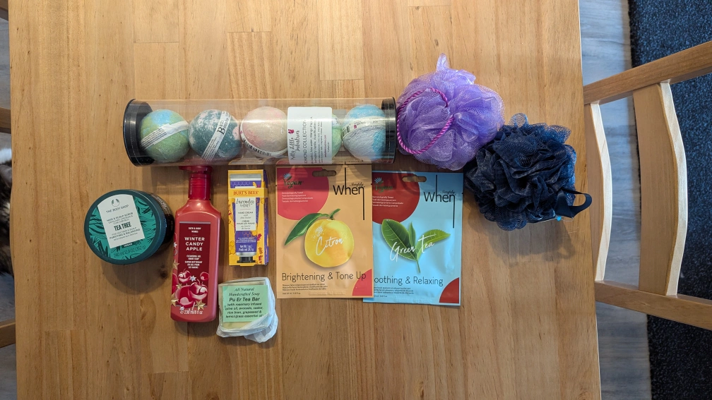 Large bundle of bath and body products. Includes bath bombs, shower gel, hand cream, face masks, and more. Brands include Bath & Body Works, Burt's Bees, The Body Shop, and Pretty Little Industries. Perfect for pampering yourself or gifting.