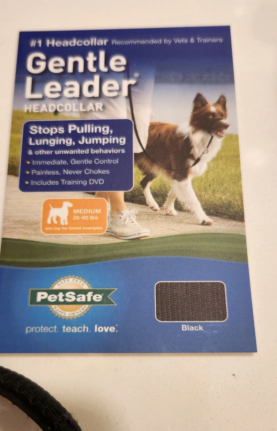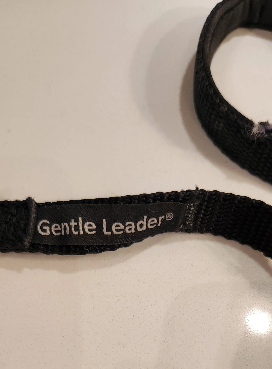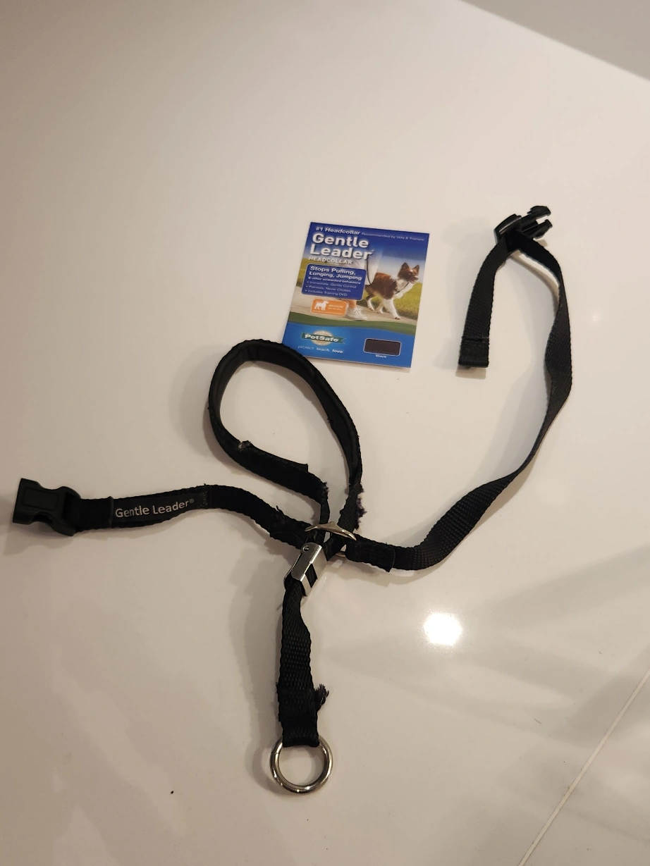 Black Gentle Leader headcollar, size medium for dogs 25-60 lbs. Some wear and tear. Stops pulling, lunging and jumping.