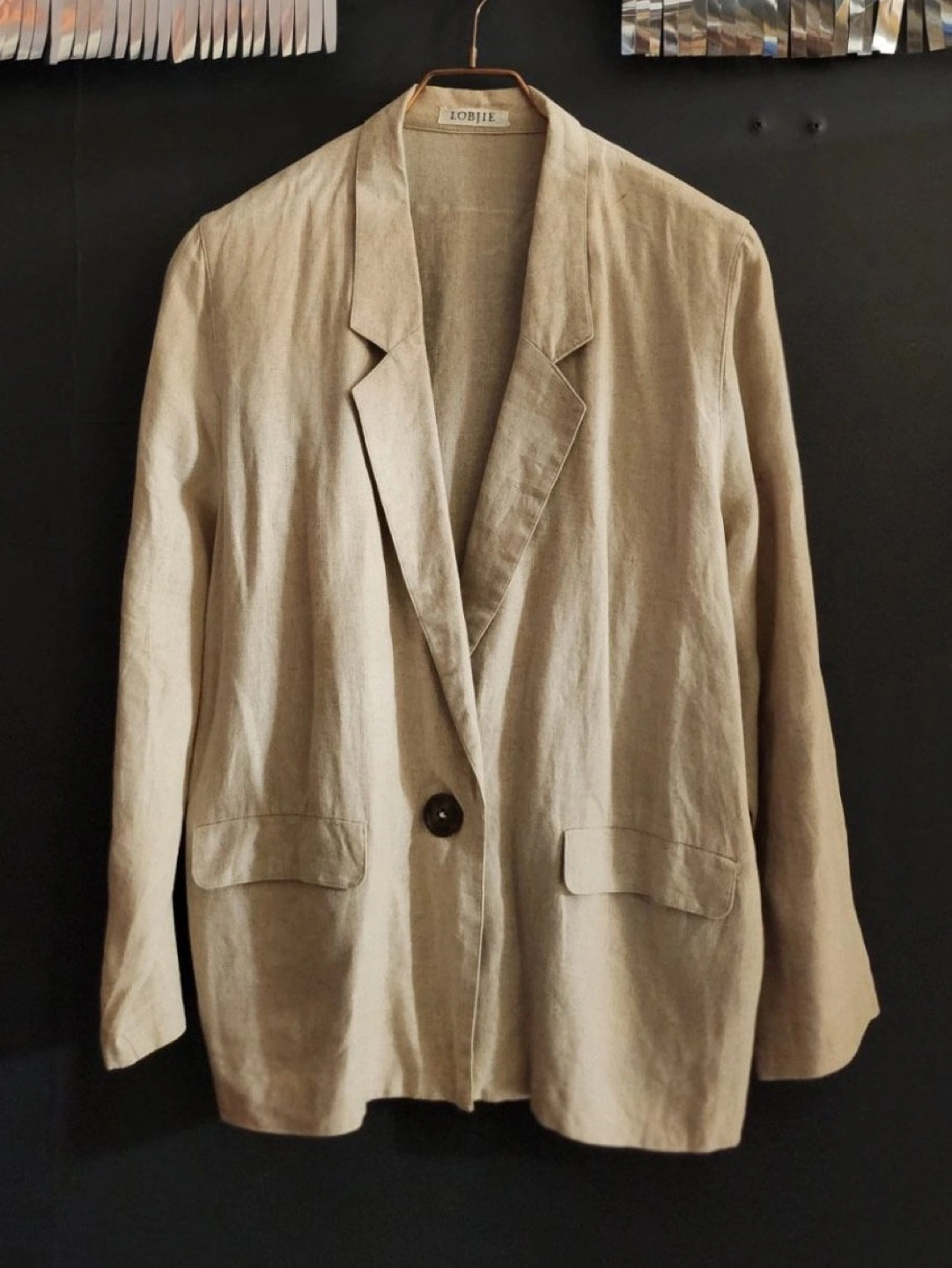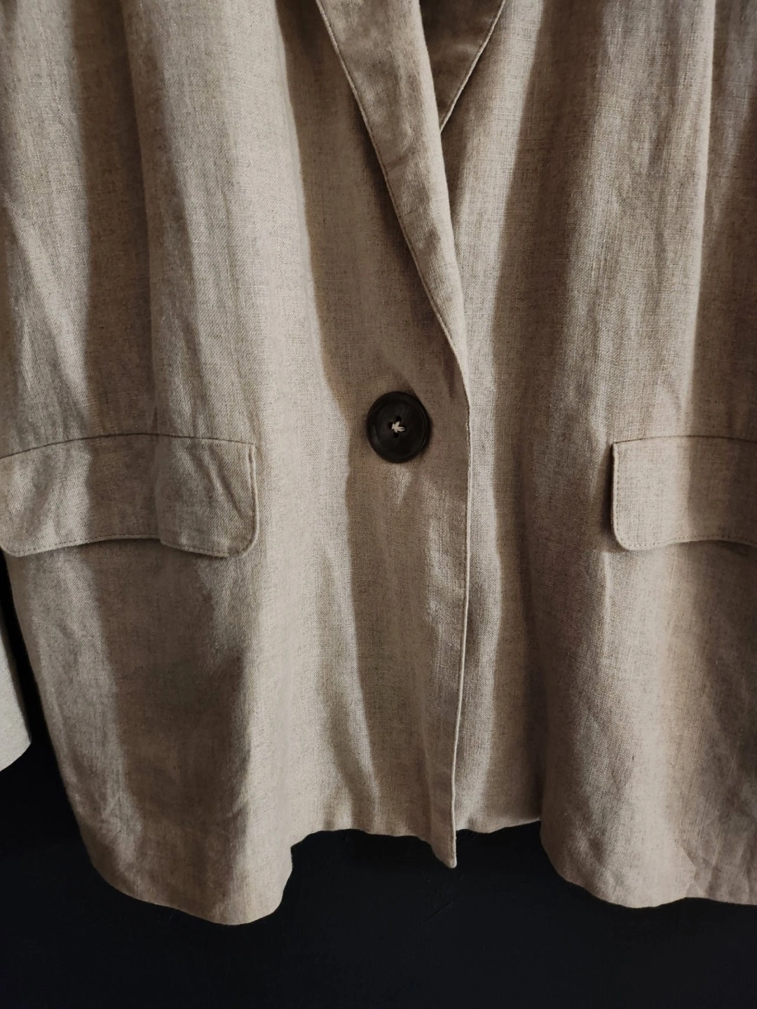 239This classic vintage blazer is crafted from 100% linen, offering a naturally textured and breathable fit that’s perfect for layering in spring and summer. The relaxed silhouette and single-button front give it a timeless, effortlessly chic look. Whether styled casually with denim or paired with tailored pieces, it adds understated elegance to any outfit. ✔ Material: • 100% Linen – lightweight, breathable, and ideal for warm weather ✔ Size: • Shoulder: 41 cm (16.1”) • Chest: 54 cm (21.3”) • Total Length: 66 cm (26”) • Recommended for M–L ✔ Features: • Natural beige tone with visible linen texture • Single-button closure for a clean, classic look • Front flap pockets • Relaxed fit perfect for layering 📌 Condition: • Overall in excellent vintage condition.