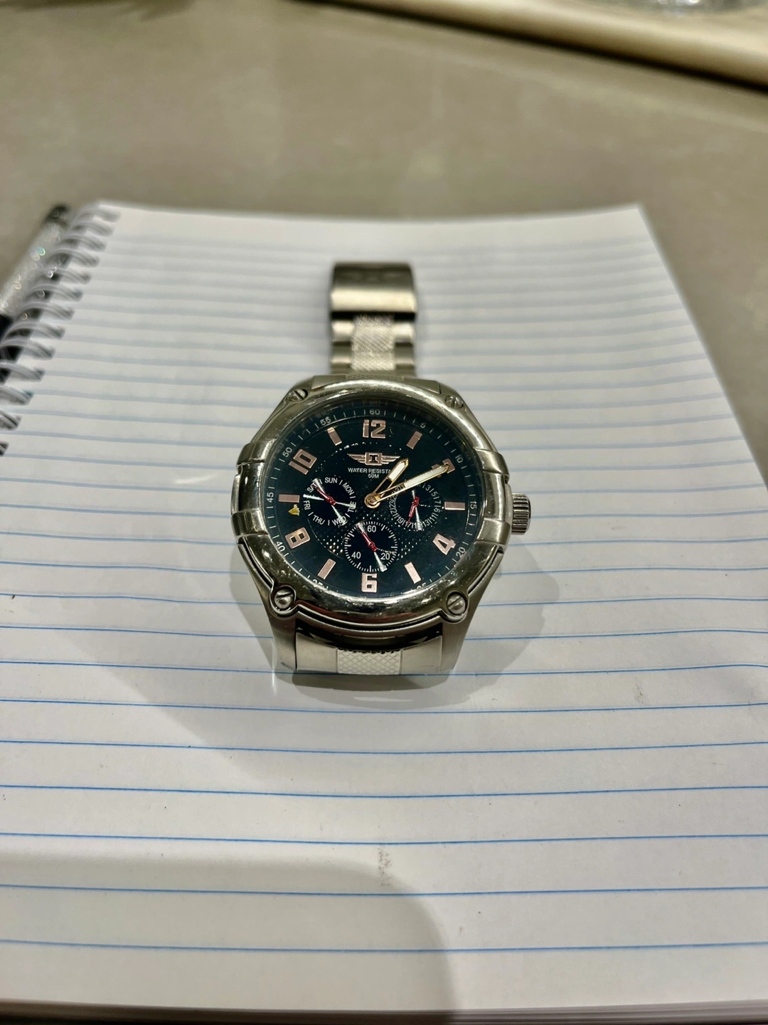 544Men's Invicta wristwatch. Silver stainless steel band and casing. Black face with rose gold accents. Chronograph features. Pre-owned.needs battery.