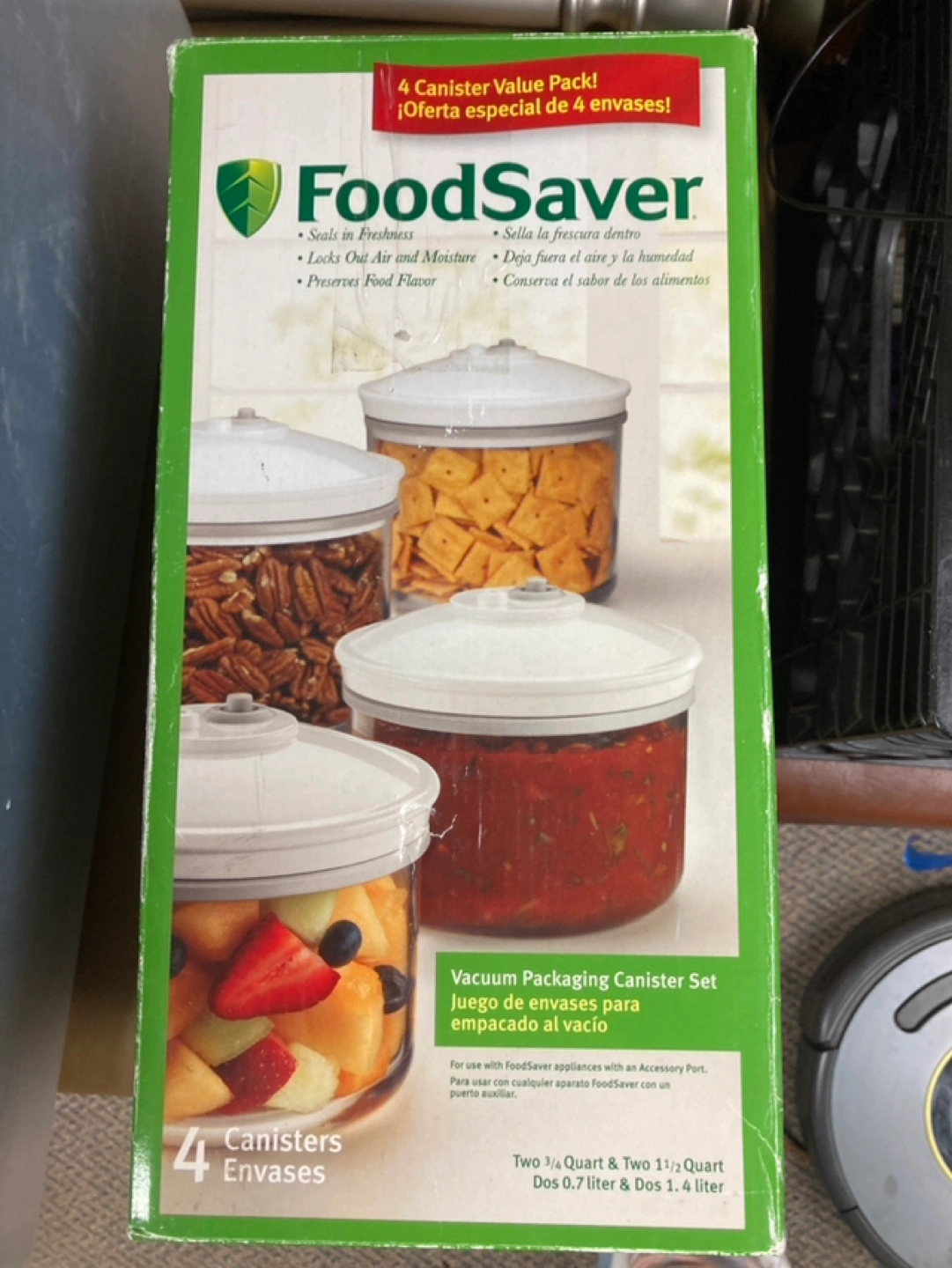 Four canisters, two 3/4 quart and two 1 1/2 quart. Vacuum seal food for freshness. Use with FoodSaver appliances with an accessory port.