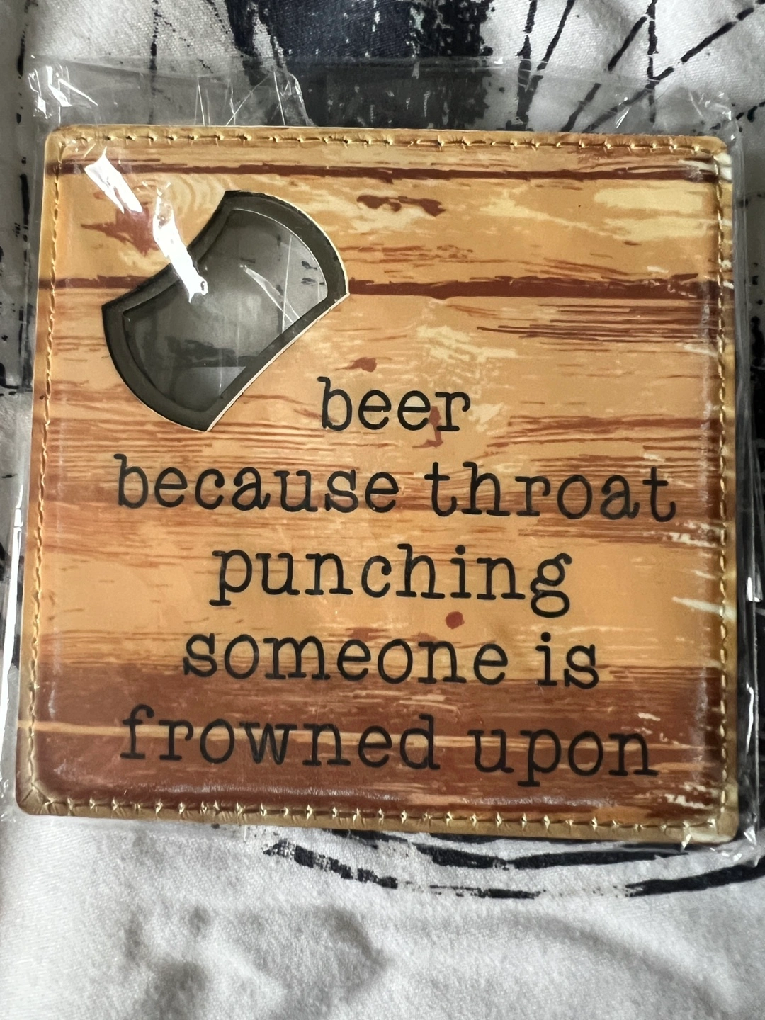 New, unused coaster bottle opener. Features a funny quote. Compact and portable. Perfect gift.