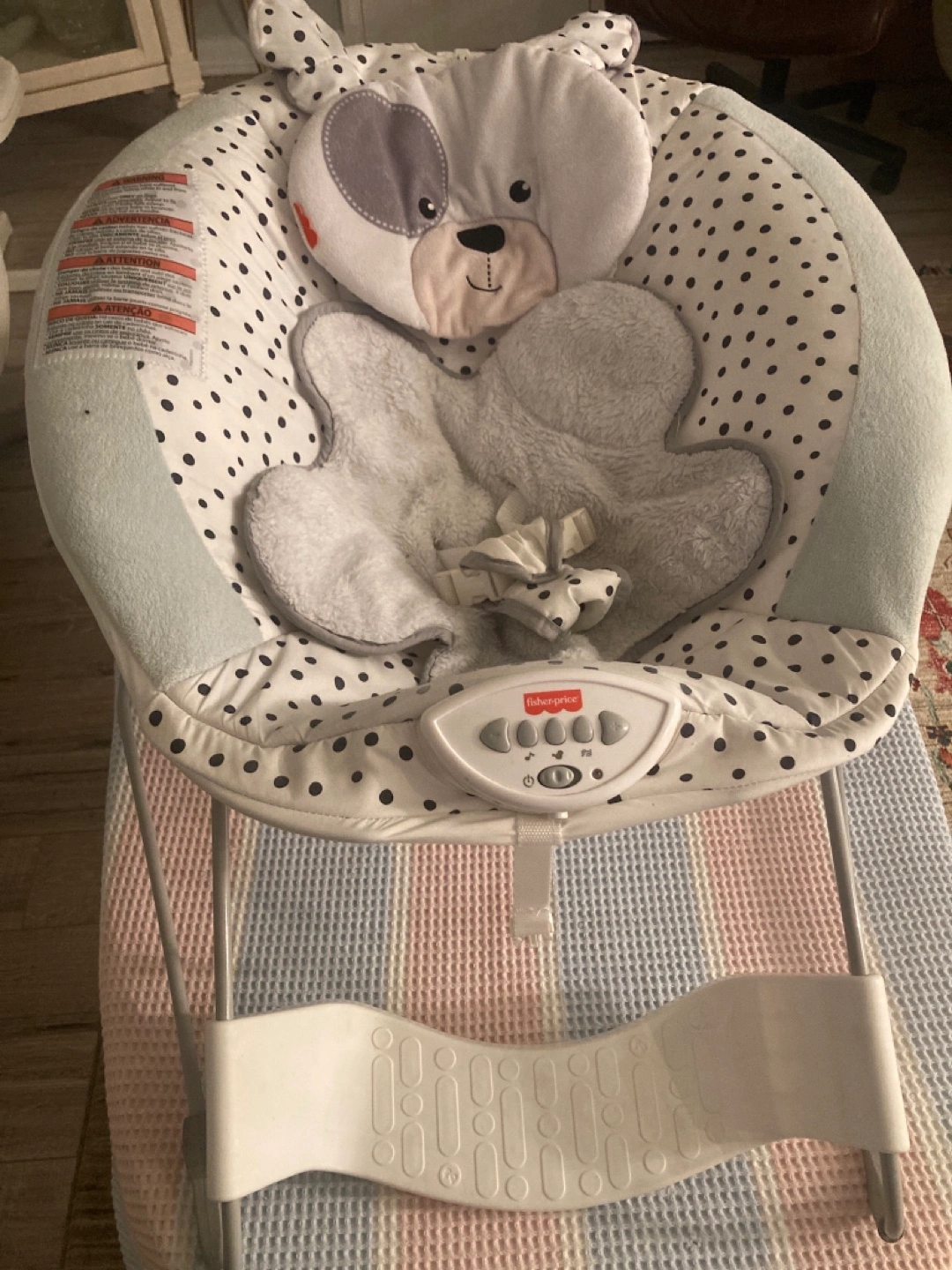 43Adorable baby swing. Grey and white polka dot design. Features a removable headrest. Includes soothing vibrations and sounds. Good condition.