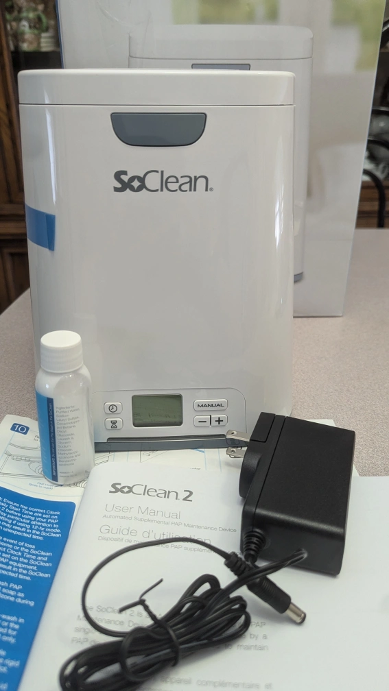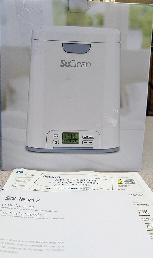 New in box. Includes device, power supply, cleaning solution, and user manual. Home use device for maintaining CPAP equipment.