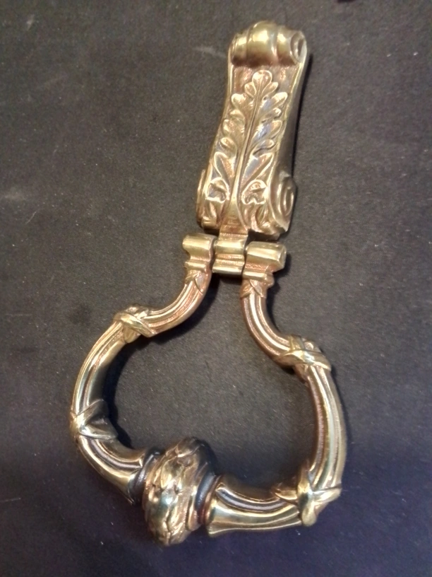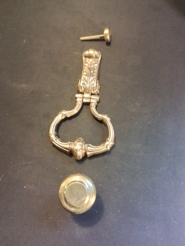 114Antique Brass Door Knocker with Knob C. 1875 Ornate brass door knocker. Features a decorative leaf design. Includes a matching round knob and mounting hardware. Elegant addition to any home. Measurements approx 7.5 x 4 inches Pickup at Young Street and Steels Ave