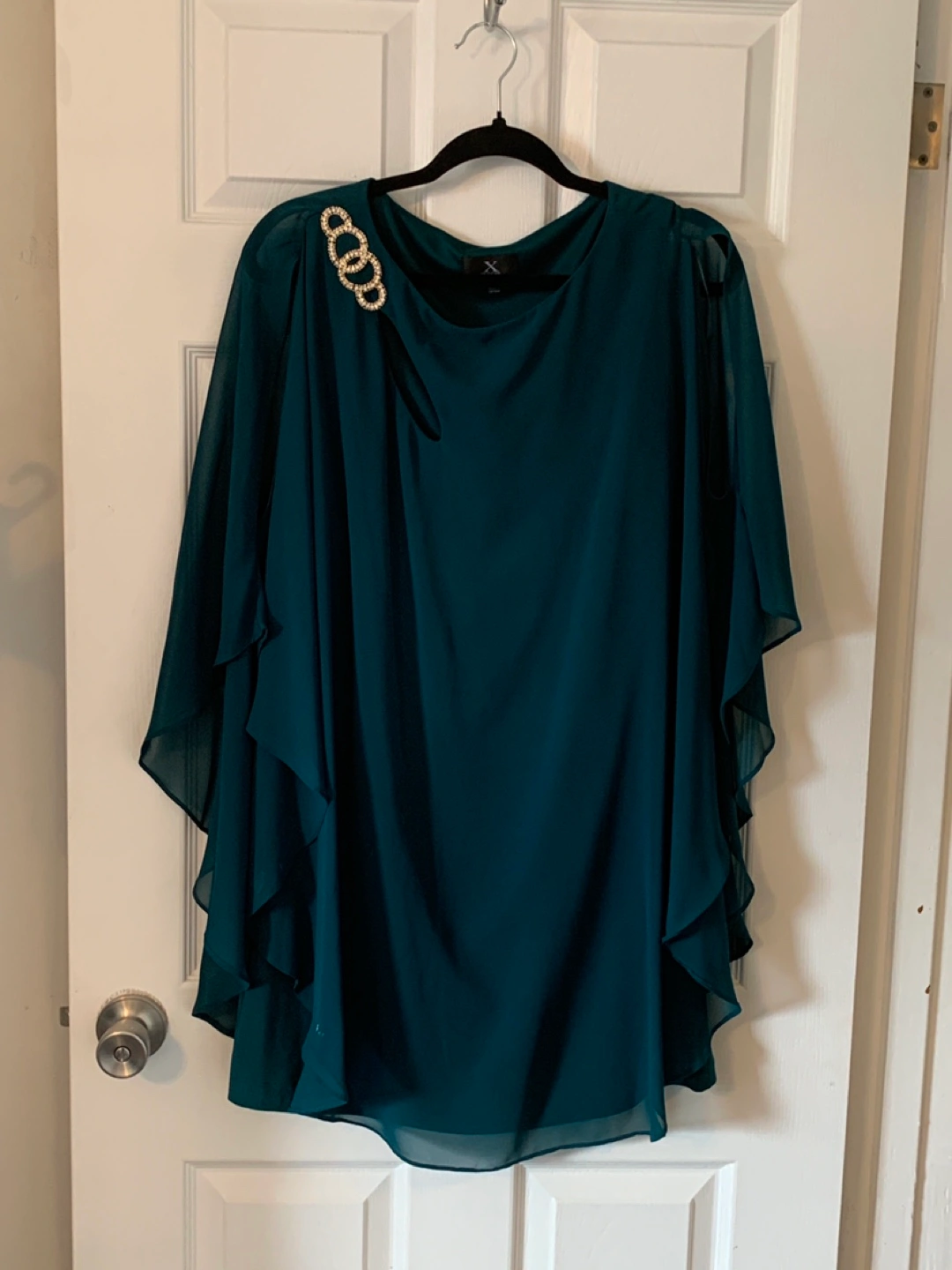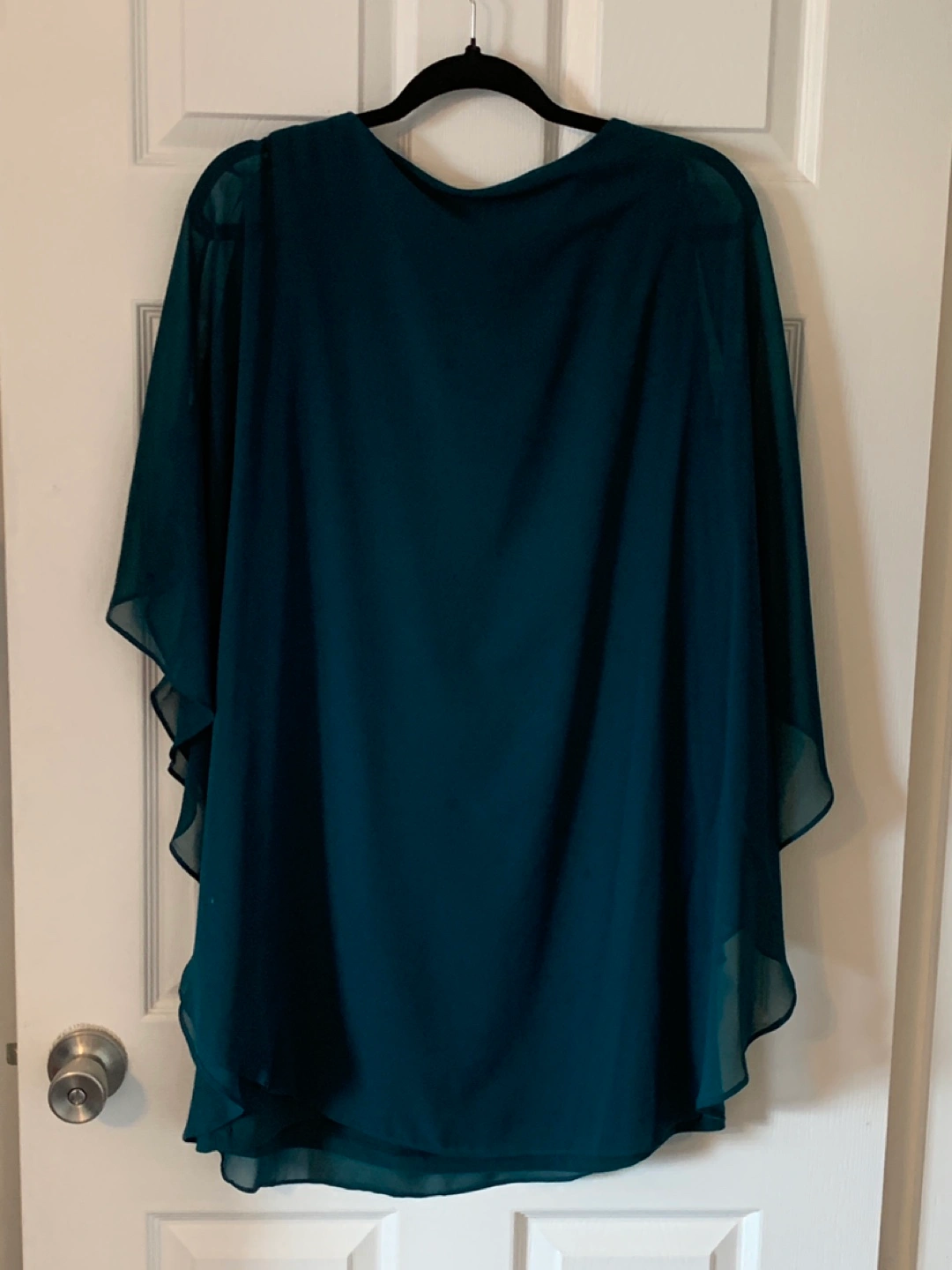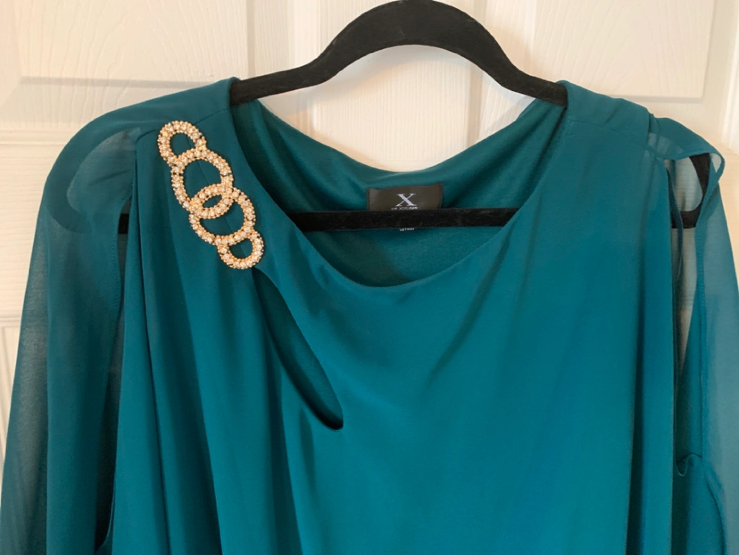 Beautiful teal chiffon dress. Features a keyhole neckline and embellished detail. Flowy and flattering. Size 12 but fits like 14/16.