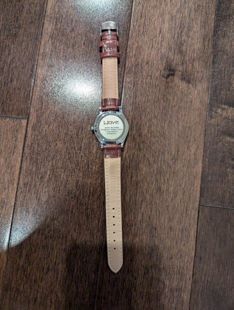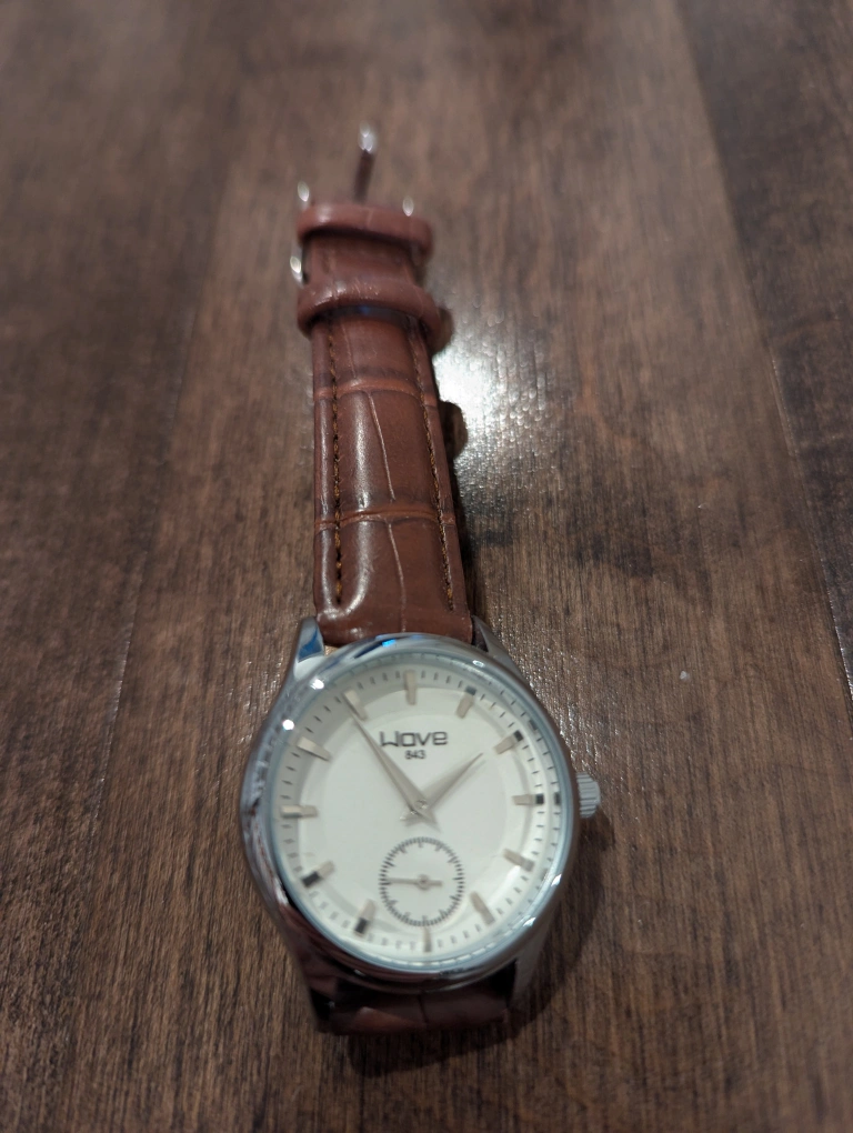 Classic analogue wristwatch. Brown leather band. Stainless steel back. Water resistant.